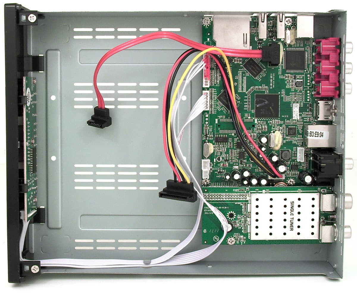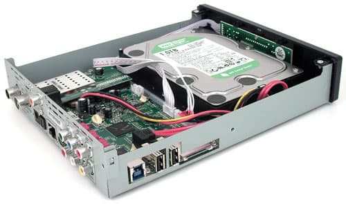 Мозги плеера прячутся в микросхеме Realtek RTD1185. Этот новый чип работает на частоте 500 МГц и на аппаратном уровне поддерживает Gigabit Ethernet, USB 3.0 и HD-звук (многоканальные DTS HD MasterAudio, Dolby Digital Plus и Dolby TrueHD). Конструкция плеера, как видно на фото ниже, обходится без вентилятора, принудительно «гоняющего» отработанный воздух. Для охлаждения начинки, включая и жёсткий диск, вполне хватает многочисленных отверстий, имеющихся по бокам и на задней стенке аппарата. Холодный же воздух забирается снизу, через отверстия, прорезанные в днище, — естественная конвекция.