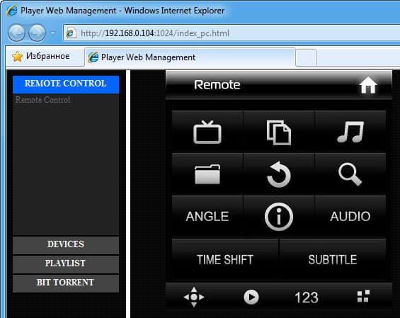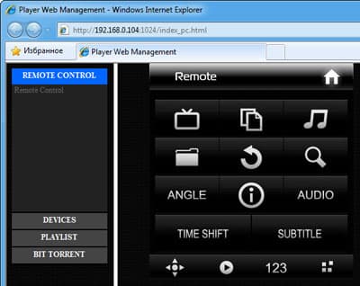 В заключение хотелось бы рассказать об одной прелюбопытной функции, имеющейся в плеере: виртуальный пульт дистанционного управления. Трудно сказать, зачем и кому этот пульт может понадобиться, но мысль, как говорится, интересная. Найти этот пульт несложно: требуется набрать в браузере следующий адрес http://IP-адрес плеера:1024/