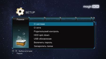Наконец, последний пункт: Разное. Сразу же бросается в глаза строка HDD Spin Down — крайне важный и нужный пункт, которого так не хватает в подавляющем большинстве всех существующих домашних медиаплееров. Этот пункт позволяет останавливать работу жёсткого диска, когда он не задействован (ведётся прослушивание интернет-станций и т. п.). Диск может «засыпать» по истечении следующих интервалов неактивности: 5, 15 или 30 минут.