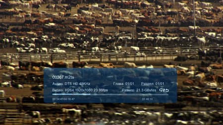 Следует отметить наличие функции быстрого перехода по файлу: для активации линейки с тонким красным ползунком достаточно нажать на ИК-пульте клавишу со стрелкой — тут же на экране появится полоса прогресса. Теперь, нажимая на пульте левую или правую стрелки, передвигая таким образом ползунок, можно быстро переместиться в нужную позицию фильма.