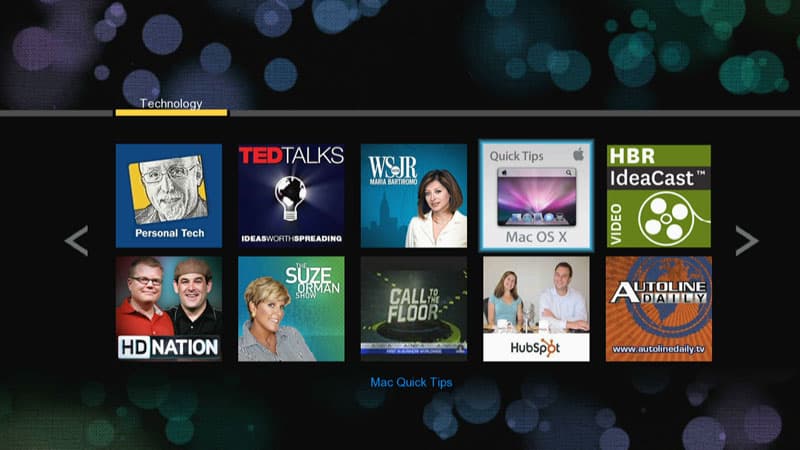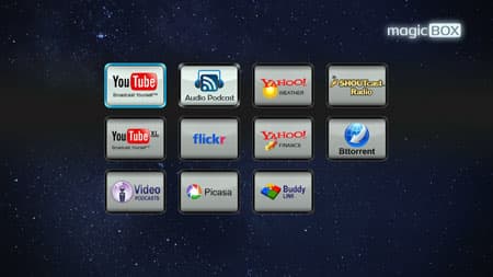 Операционная система загружается в течение 15-20 секунд, после загрузки пользователь увидит главное стартовое окно. По умолчанию активной является иконка цифрового ТВ, всего же здесь восемь анимированных пиктограмм: DTV, Проводник, Видео, Музыка, Фото, Интернет СМИ, Веб-браузер и Настройки. Притормаживаний во время перелистывания иконок или страниц меню не наблюдается, прошивка чётко и внятно отрабатывает нажатия клавиш пульта управления.