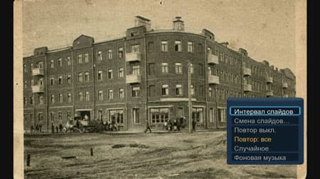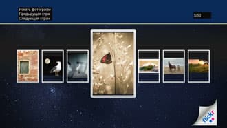 Управление просмотром фотографий проще всего осуществить, вызвав командное меню кнопкой на ИК-пульте. С помощью команд, доступных, здесь, становится возможным настроить длительность отображения фото (2, 5, 10 и 30 секунд), выбрать тип перехода (восемь предустановок) и фоновое музыкальное сопровождение.