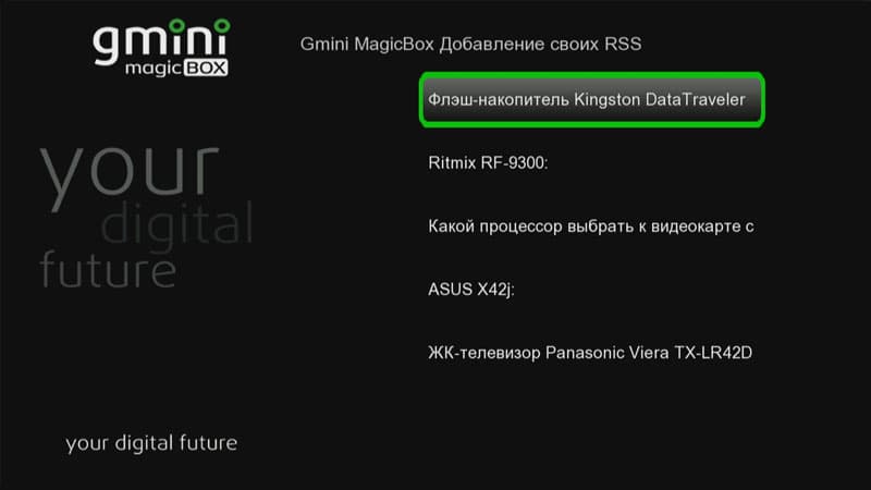 Записанные таким образом передачи впоследствии можно найти на USB-накопителе, который пользователь заранее подключил к плееру (подойдёт и обычная флешка, благо поток передач невелик, от 300 до 2000 Кбит/с в зависимости от канала и качества вещания).