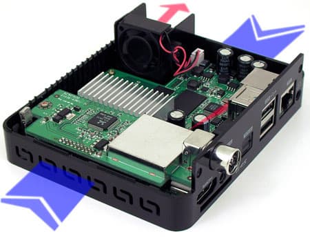 Разобрав корпус, можно увидеть как конструкцию плеера, так и систему его охлаждения в действии: забираемый снаружи воздух проходит сквозь блок DVB-T и печатную плату с электронными компонентами, по пути обдувает радиатор процессора, и под воздействием вентилятора выводится наружу. Для упорядочения воздушного потока выдув вентилятора организован с помощью боковых заслонок.