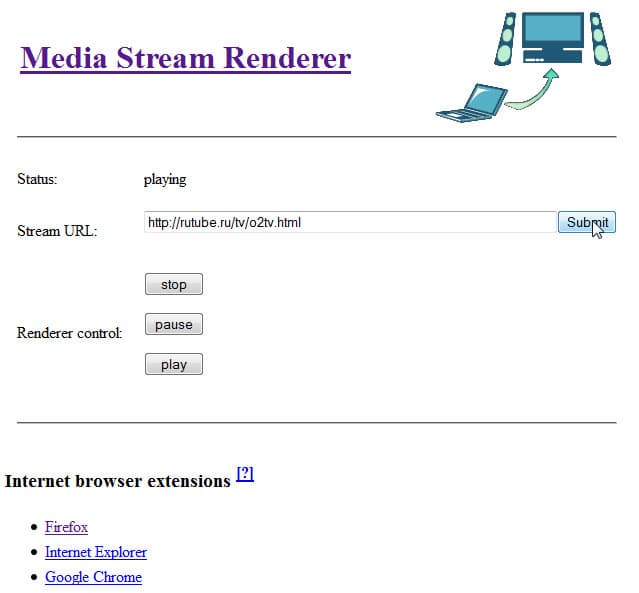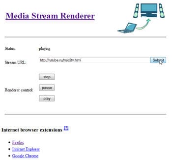 Если с первыми двумя всё понятно (стандартные YouTub-ы, Vimeo и тематические каналы), то третий пункт требует более детального разбора. Этот Media Stream Renderer предназначен для проигрывания медиассылок на плеере с локального компьютера. Чтобы использовать эту технологию, требуется зайти с локального компьютера на страницу http://IP-адрес плеера/cgi-bin/renderer, установить плагин для своего браузера, выбрав его название внизу страницы. После перезагрузки браузера требуется снова зайти на предыдущую страницу, запустить на плеере сервис Media Stream Renderer, вновь вернуться к ПК, ввести в окно Stream URL ссылку на потоковое видео и нажать Submit.