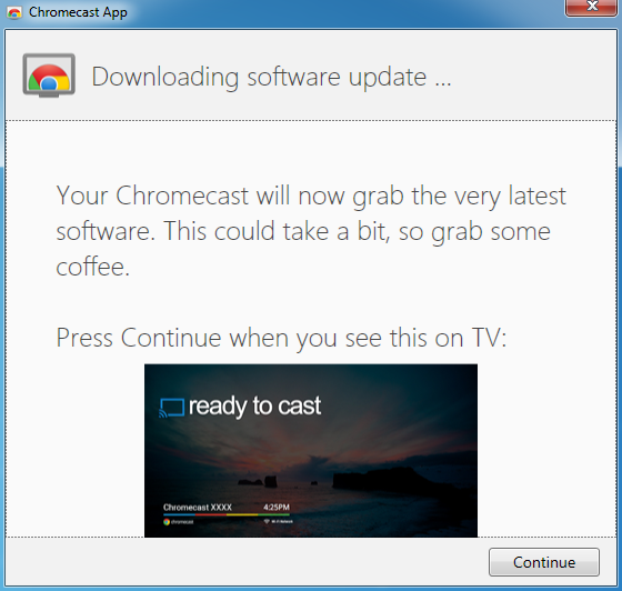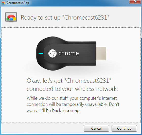 После непродолжительной загрузки на экране телевизора появилась информация о дальнейших шагах настройки плеера — предложение посетить соответствующий раздел на сайте производителя. С него на ПК мы загрузили соответствующую утилиту, которая при первом запуске расстроилась из-за отсутствия беспроводного контроллера. Пришлось установить в компьютер USB-адаптер Wi-Fi. После этого программа нашла беспроводную сеть Chromecast, подключилась к ней и показала доступный на устройстве список беспроводных сетей.