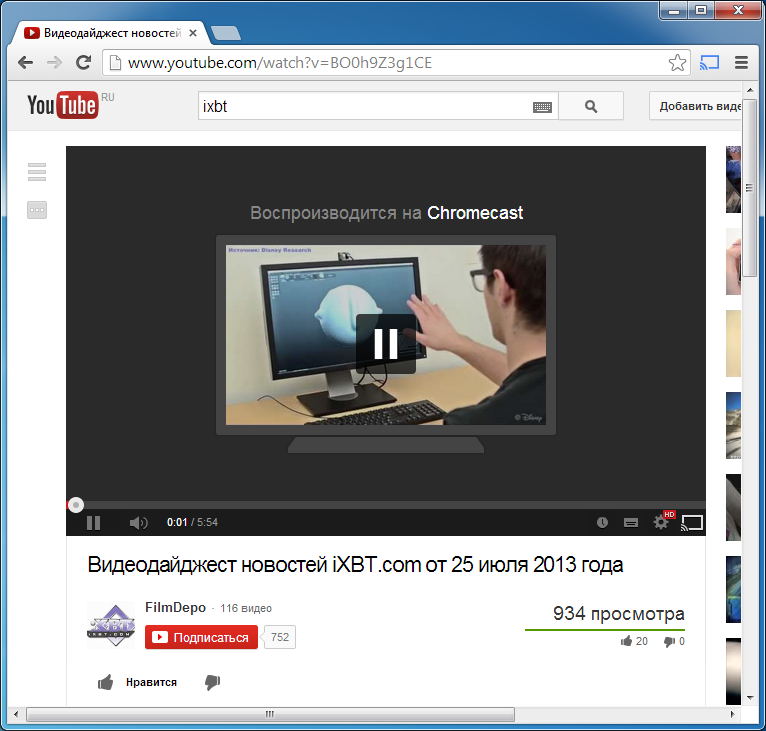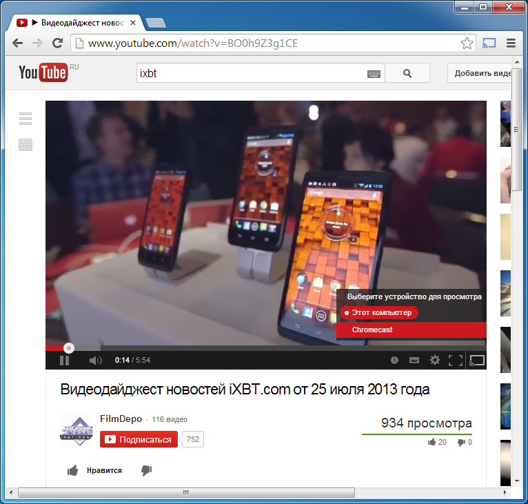 Для YouTube переключение на телевизор можно делать как из фирменного клиента на смартфоне для Android и iOS, так и из его клиента для Google Chrome в Windows и Mac OS (в других браузерах такой возможности нет).