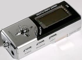 - Функции записи, видимо, также переходят в разряд обязательных в современных цифровых аудиопроигрывателях, а запись становится совершенно немыслимой без наличия встроенного MP3-кодера. Специально для записи речи плеер поддерживает также форматы TVF и TCW (ADPCM), однако для таких задач все же лучше приобрести специализированный диктофон (хотя бы из-за возможности подключения внешнего микрофона за счет наличия встроенного предусилителя). Запись может производиться с радиоэфира, линейного входа или встроенного микрофона. В первых двух случаях максимальным качеством является 44 кГц 224 Кбит/с, чего обычно более чем достаточно. Для экономии памяти можно снизить частоту дискретизации и/или битрейт (минимальное значение 16 кГц 32 Кбит/с вряд ли кому пригодится, а вот нечто типа 32 кГц 112 Кбит/с неплохо подойдет для записи с кассет, например). Существуют также возможности автоматически «нарезать» запись на треки по паузам, причем длина паузы, после которой плеер будет считать, что началась новая песня, настраивается и может составлять от 1 до 10 секунд. При записи со встроенного микрофона максимальные параметры составляют 22 кГц 112 Кбит/с, что с запасом перекрывает как рабочие параметры микрофона, так и вообще человеческого голоса :) Так что в данном случае вполне логичным будет снижение качества записи или вообще отказ от MP3 в пользу TVF. Разумеется, обработка пауз присутствует и в этом режиме, так что при ее задействовании можно неплохо сэкономить память.