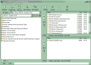 Перед вами основное окно Download Manager В принципе, программа похожа на аналоги по основным функциям, но несколько отличается от них в плане реализации. Так, работа со встроенной памятью и картой расширения происходит одновременно, что достаточно удобно. Прямо в главном окне можно быстро переписать файлы с компьютера или обратно (никакой «антипиратской» защиты нет МР3-файлы можно переносить свободно), отсортировать их в памяти плеера или на карте или удалить вообще. Левое окно предназначено для навигации по файловой системе на компьютере. Есть строка для быстрого перехода по каталогам, а так же нечто типа «Избранного». Имеется возможность фильтрации файлов если вы не планируете использовать плеер как носитель данных, можно пометить соответствующий чекбокс, после чего в левом окне будут отображаться лишь МР3-файлы. Можно просто выделять файлы и копировать их, но есть способ и лучше.