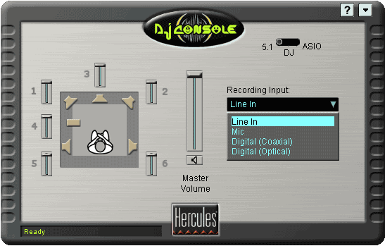 Панель управления устройства выполнена в виде одного окошка с тремя вкладками, на которых расположены различные настройки. Переключение между вкладками приводит к автоматической активации одного из трех режимов работы DJ Console. Таким образом, вкладка 5.1 подразумевает работу консоли в режиме обычной шестиканальной карты.