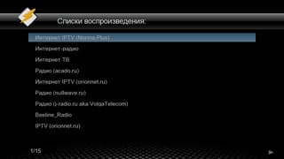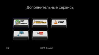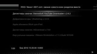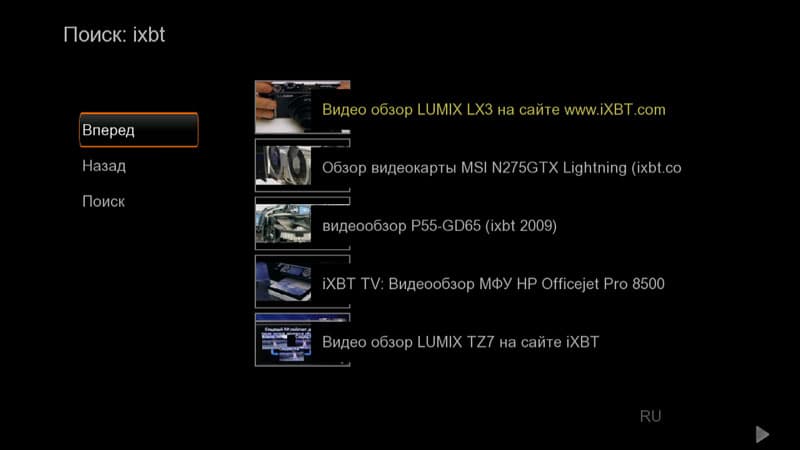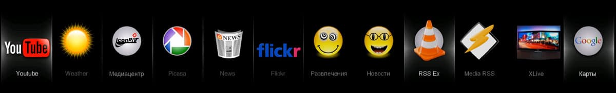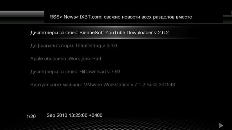 Зайдя в канал YouTube, мы обнаруживаем, что здесь возможен просмотр видео самых разных категорий, но имеется также и пользовательский, текстовый поиск видео. Прогноз погоды стал уже привычным для каждого «продвинутого» домашнего медиаплеера. Медиацентр состоит из множества ссылок на Интернет-ТВ и радиостанции. На ресурсе Picasa возможен текстовый поиск фото, новостные ленты могут пополняться пользовательскими адресами (только очень уж долго и неудобно набирать URL на этой проклятой виртуальной клавиатуре). Сервис Развлечения битком набит ссылками на всевозможные юмористические ресурсы, Новости полны ссылками на русскоязычные новостные сайты. Следующий сервис — XSPF — это громадный сборник плейлистов в одноимённом формате, Media RSS — также обновляемые списки ссылок на различные каналы (которые, по всей видимости, вещаются конкретными провайдерами). XLive! — это огромный сервис с множеством тематических телеканалов (понравилось, что работают почти все из них, но, к сожалению, все они англоязычные), и, наконец, карты Google — вот уж удовольствие поглазеть сверху без компьютера на свой город и даже дом!