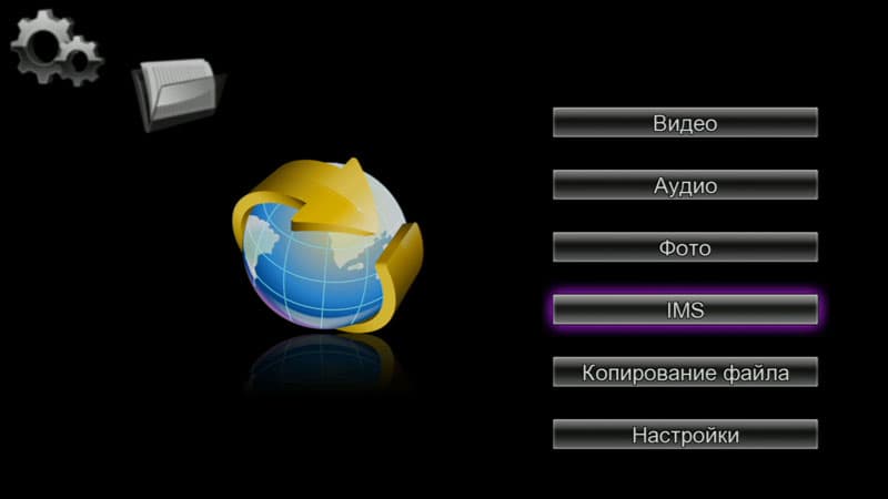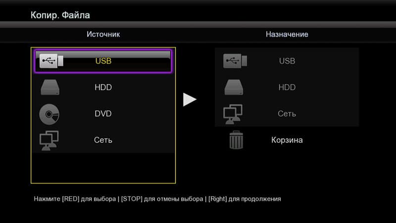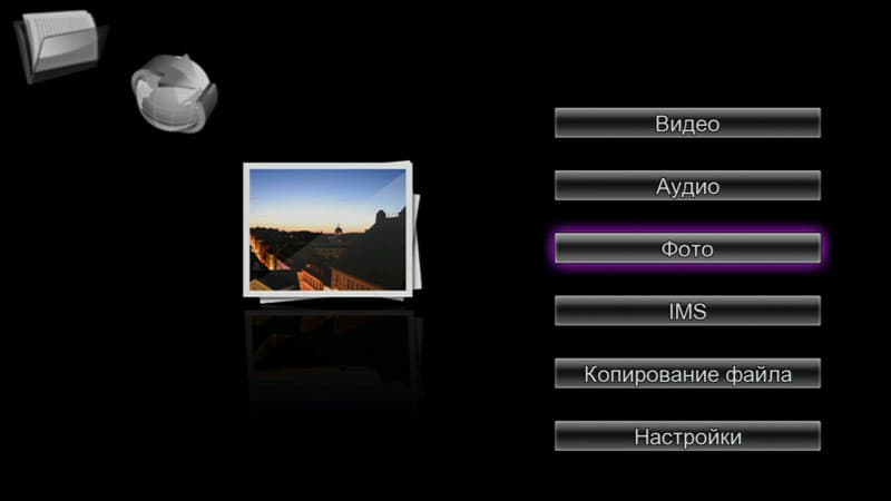 Убедившись, что настройки отвечают требованиям (а что тут, собственно, настраивать, кроме соотношения сторон кадра и системы видеовыхода?), следует вернуться в главное меню и выбрать носитель, с которого вы в данный момент желаете просмотреть свой контент. Это последняя в главном меню пиктограмма Устройства.