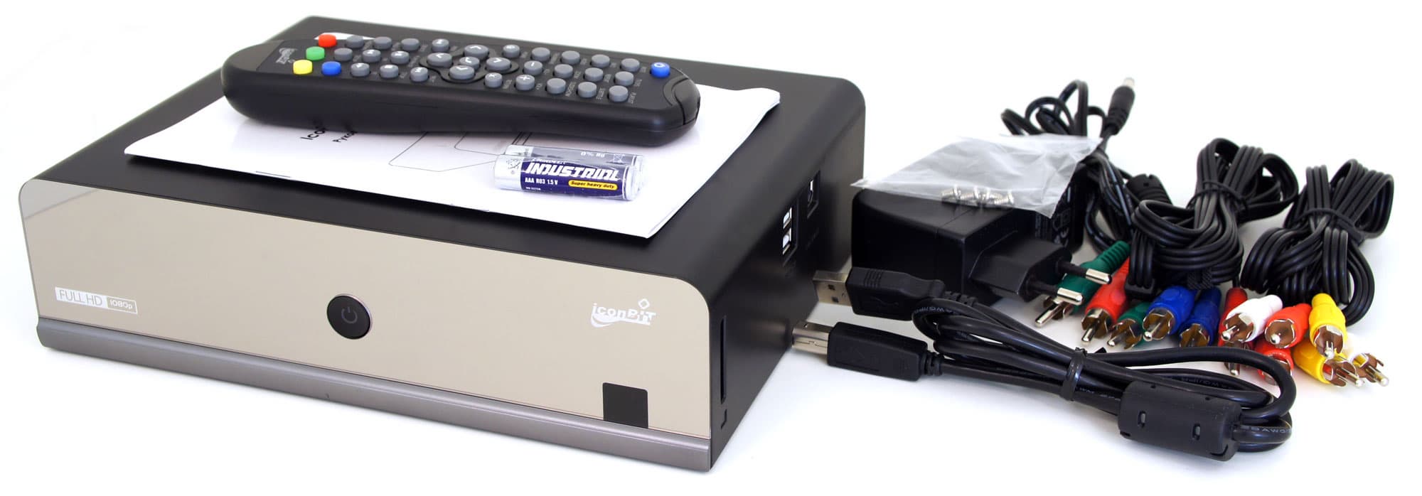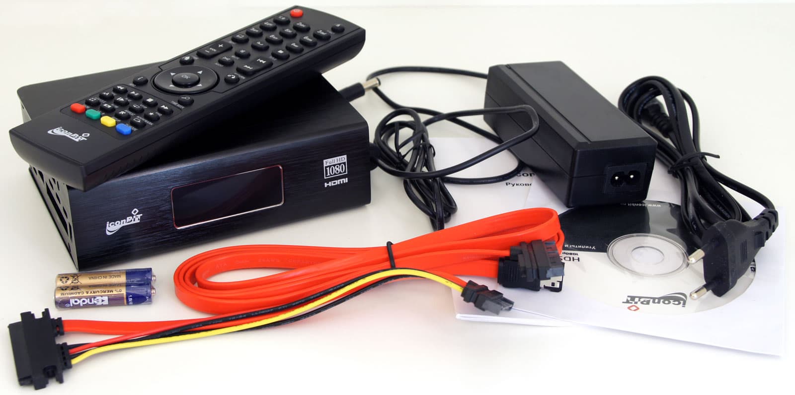 Аппарат комплектуется пультом дистанционного управления с батарейками, внешним блоком питания, инструкцией, компакт-диском с ПО и инструкциями, а также кабелями для подключения дополнительного внешнего жёсткого диска. Никаких видеокабелей в комплекте не предусмотрено.