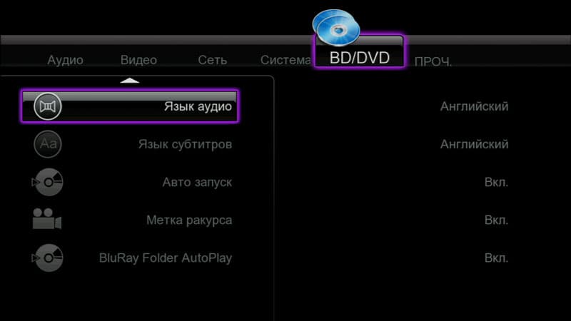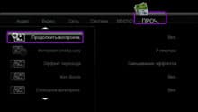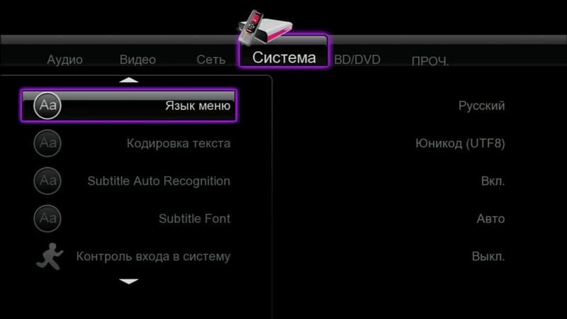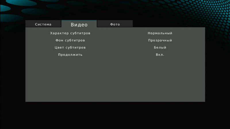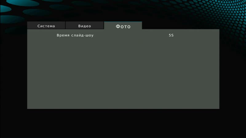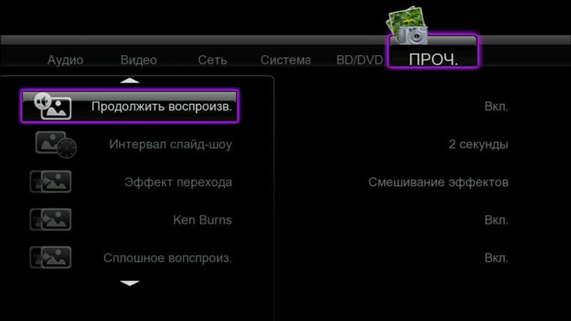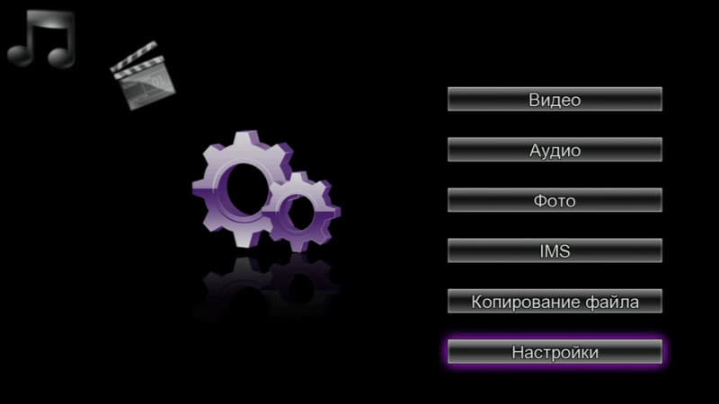 | Системные настройки: язык меню, шрифт субтитров по умолчанию, замок от детей (загрузка плеера по паролю; по умолчанию — 0000), обновление прошивки | Настройки воспроизведения папок с данными DVD-видео и Blu-ray | Прочие настройки: продолжение воспроизведения, интервал фотослайдшоу (от двух секунд до двух минут), выбор переходов в фотослайдшоу, расположение фоновой музыки для фотослайдшоу, заставка экрана, предварительный просмотр выделенных в браузере файлов и пр. |
