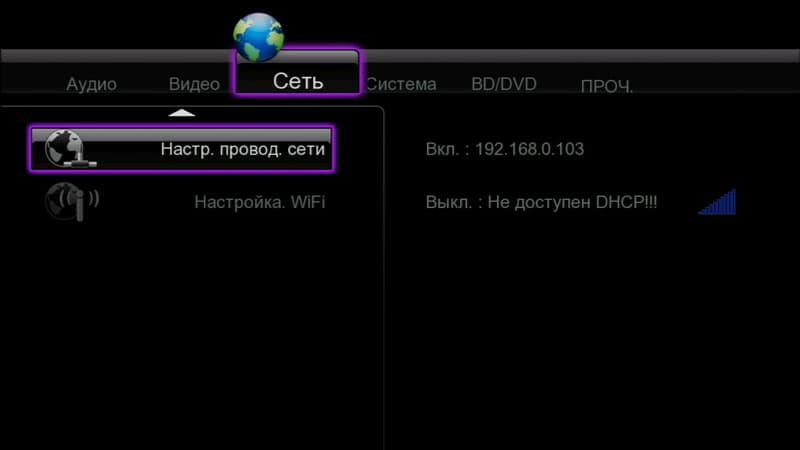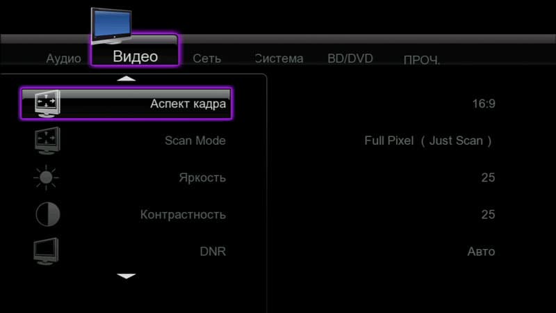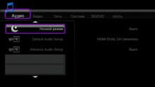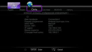 | Настройки звука включают в себя выбор интерфейса вывода звука по умолчанию (HDMI, SPDIF и т.д.), в т.ч. звука различных форматов | Настройки видеовыхода: аспект кадра, метод оверскана (CRT/LCD), яркость/контраст, разрешение (от PAL/NTSC до 1920х1080 60p) | Сетевые настройки: проводная сеть (авто/ручные настройки); беспроводная сеть (WiFi), до трёх соединений |