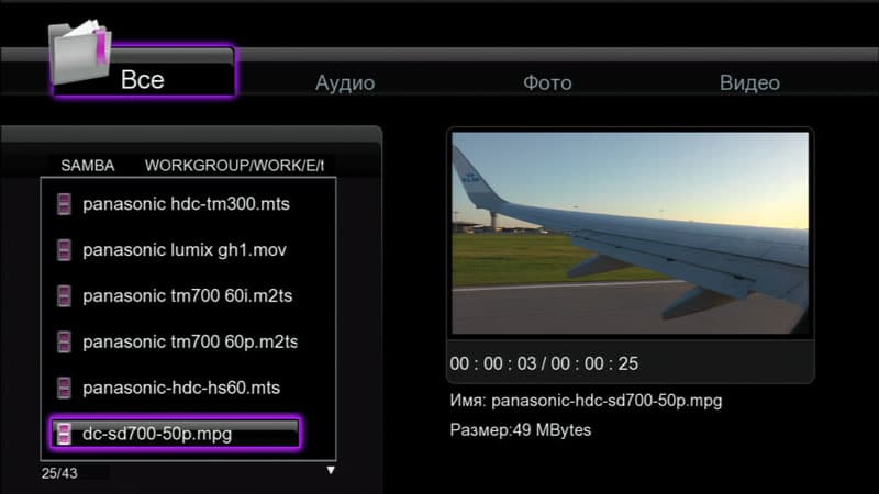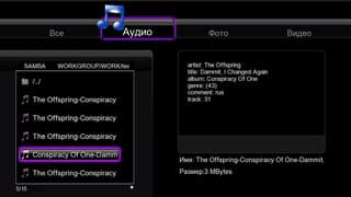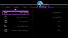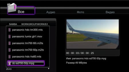 Активация первых трёх пиктограмм приводит к запуску файлового браузера, в котором станут отображаться только те типы файлов, которые соответствуют выбранному пункту: фильмы, музыка, либо фото. Остальные типы файлов будут скрыты от пользователя. Польза от этих режимов, мягко говоря, спорна. Вполне возможно, такое «удобство» будет полезно пользователю, не обременённому основными знаниями форматов, и у которого весь домашний медиаконтент свален в одну кучу папку. Навести порядок в этой папке он обещает себе вот уже второй год, однако, в настоящий момент, за неимением времени, ему удобнее просто нажать пиктограмму Фильмы, и — о чудо! — сотни других аудио- и графических файлов, находящихся в этой же папке, не мешаются! Их просто не видно.