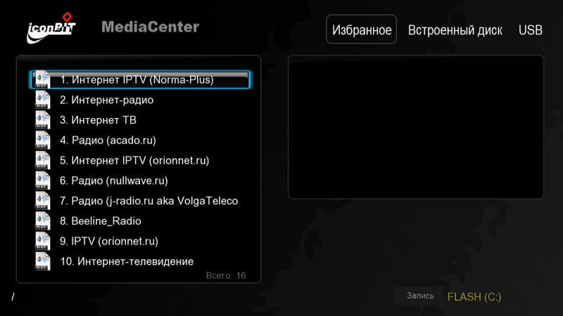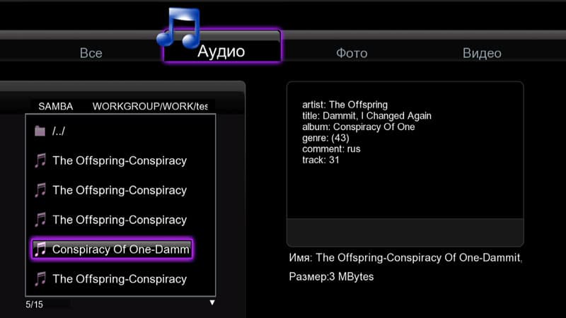 Здесь имеется список всех носителей, которые в данный момент подключены к плееру. Жёсткий диск, флэшки, внешний жёсткий диск — всё то, что при загрузке распознал плеер.