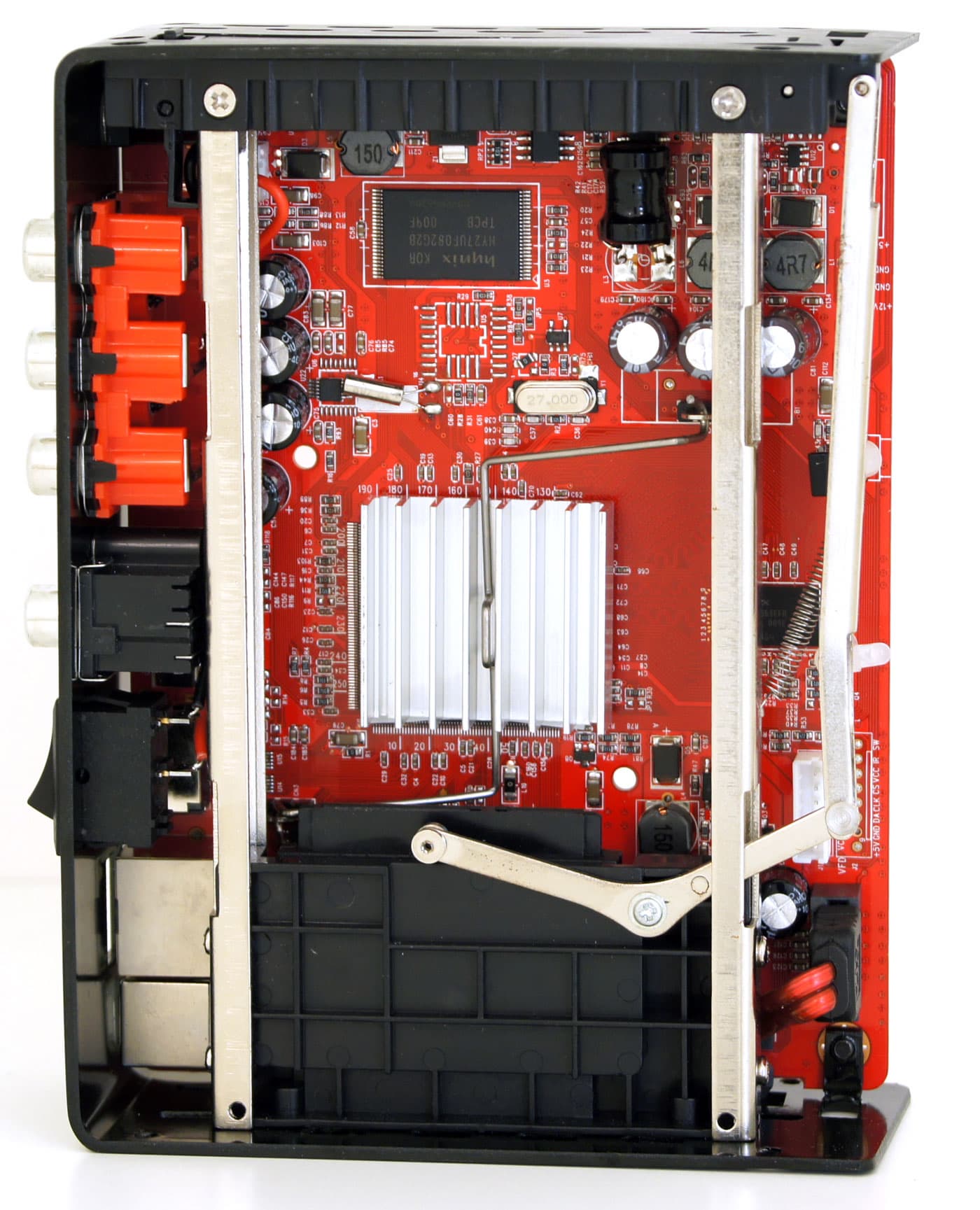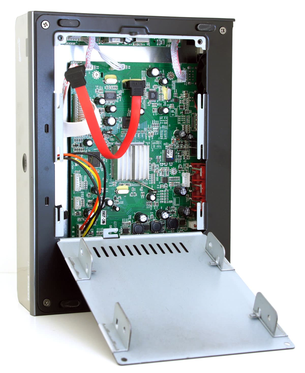 Печатная плата занимает всё без исключения внутреннее пространство плеера; главный чип Realtek RTD1073 накрыт подпружиненным радиатором, помогающим рассеивать тепло.