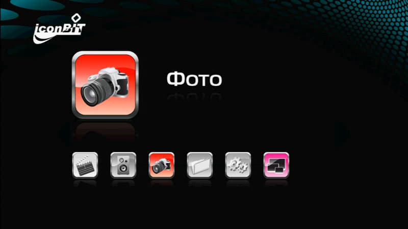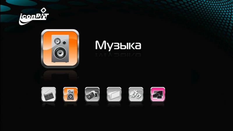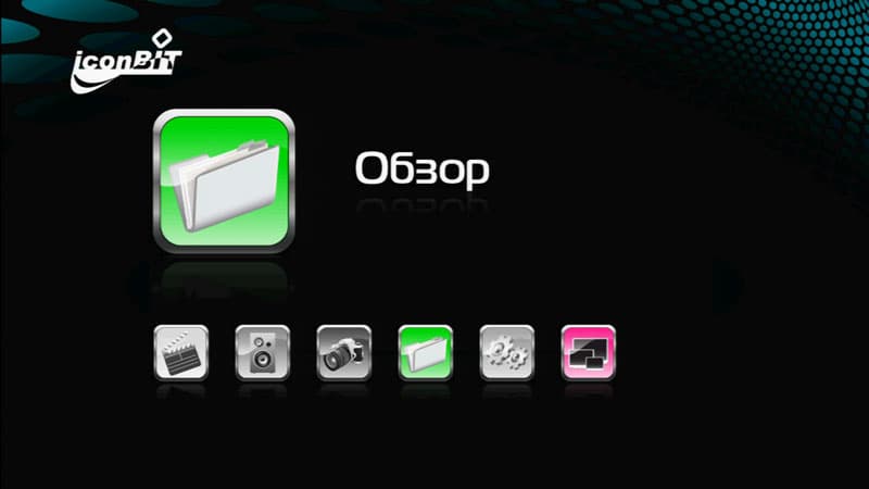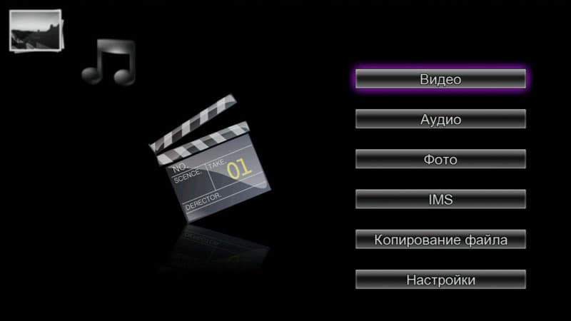Время включения плеера составляет 10 секунд, после чего на экране телевизора появляется главное меню, состоящее из шести разделов: