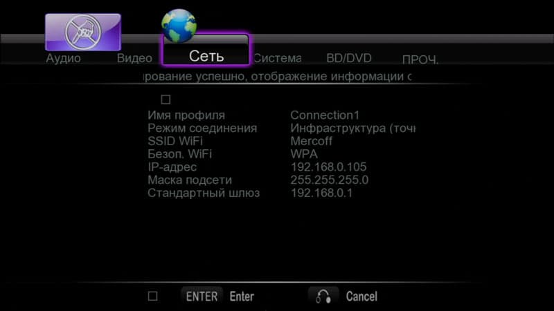 Если с проводной сетью в большинстве случаев всё просто (вставил кабель, идущий к роутеру — и готово!), то установка беспроводной сети требует от пользователя определённых знаний. Во-первых, не ошибиться с приобретением WiFi-адаптера. Производитель рекомендует использовать USB Wi-Fi адаптеры на чипсетах RealTek RTL-8191SU/8192SU. Адаптеров с такими чипсетами у нас под рукой не оказалось, но не беда: плеер с удовольствием подхватил имеющийся адаптер, построенный на чипсете Realtek RTL8188SU, и после секундного сканирования была найдена нужная сеть. Недолгая процедура ввода ключа, и сеть установлена!
