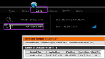Во время долгой работы корпус плеера нагревается незначительно, несмотря на отсутствие вентилятора. Просмотр с жёсткого диска описывать нет никакой необходимости — скучно. Нам более интересен просмотр по сети, именно при нём возникают проблемы. Например, вот такая: при беспроводном подключении роутер сообщает о клиенте, подключённом в данный момент по стандарту 802.11n, то есть, скорость беспроводной сети максимальна (обратите внимание, и уровень сигнала устойчиво держится на 100%).
