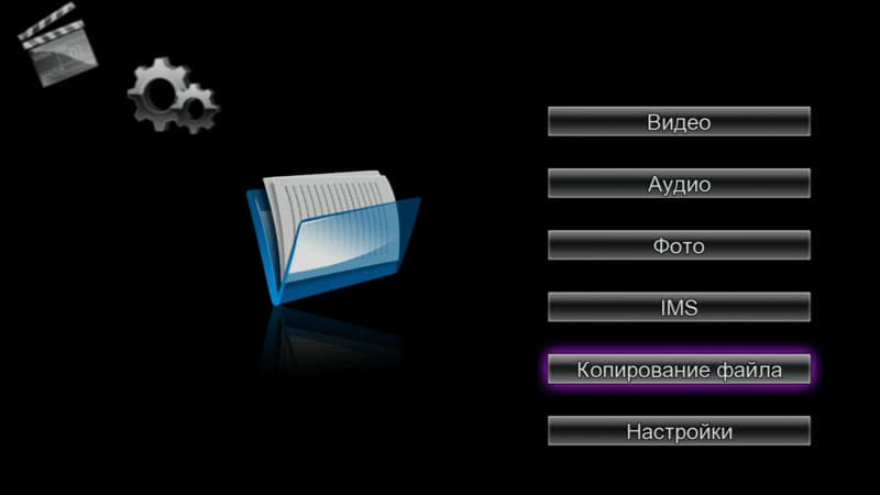 Присутствущая в плеере возможность самостоятельно, без ПК, копировать и перемещать файлы из одного источника в другой, осуществлена посредством специального файлового браузера (пункт Копирование файлов в главном меню). Здесь пользователю нужно выбрать источник, «пункт назначения» файла, файлов или целых папок с файлами, и… Всего лишь следовать подсказкам, появляющимся внизу экрана.