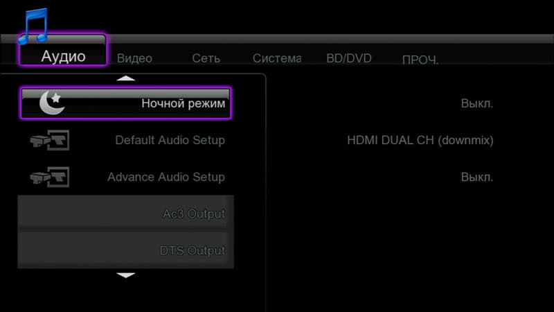 К сожалению, плеер не умеет аппаратно декодировать такие аудиоформаты, как DTS и Dolby Digital EX (7.1). Для того, чтобы услышать такой звук в оригинале, придётся подключить плеер к ресиверу по одному из цифровых аудиовыходов, либо по HDMI к телевизору.