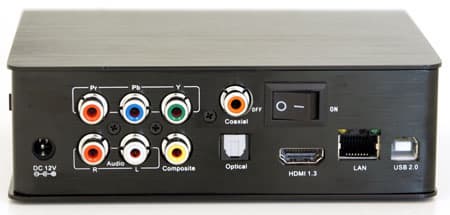 Задняя панель целиком занята следующими интерфейсами: компонентный видеовыход, композитный аудио-видеовыход, цифровые коаксиальный и оптический аудиовыходы, выход HDMI версии 1.3 и порт LAN для подключения к локальной сети, порт USB для подключения плеера в режиме внешнего жёсткого диска к ПК либо другому устройству (даже другому плееру). Питание аппарата включается клавишей, расположенной здесь же.