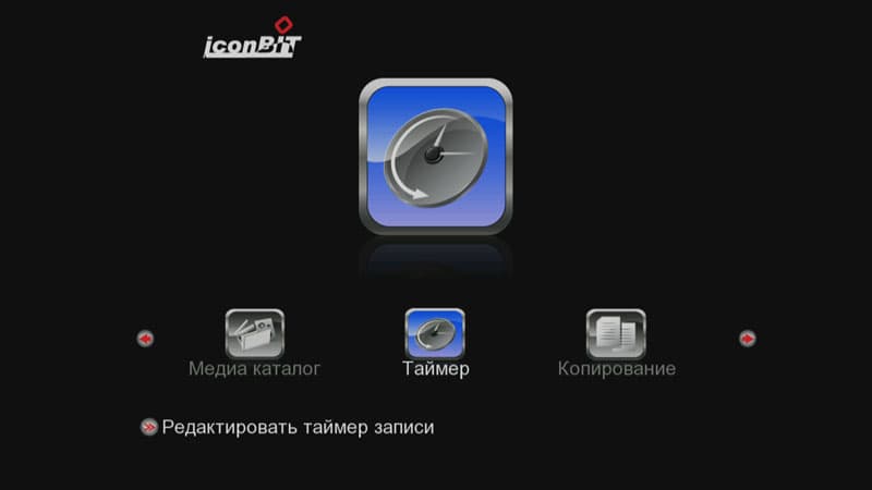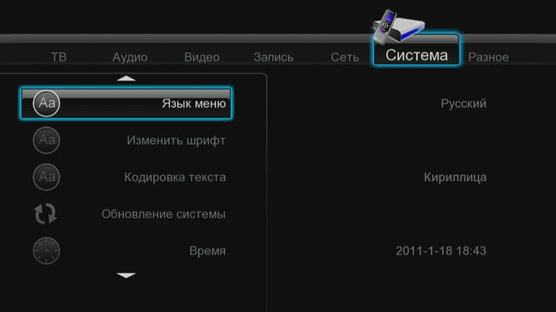 Главное меню плеера состоит из десяти иконок, активной по умолчанию является самая первая в пролистываемом списке — DVB-T.