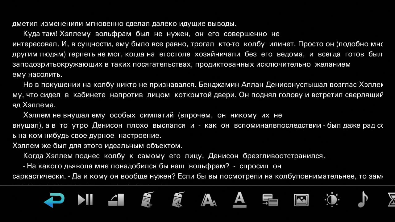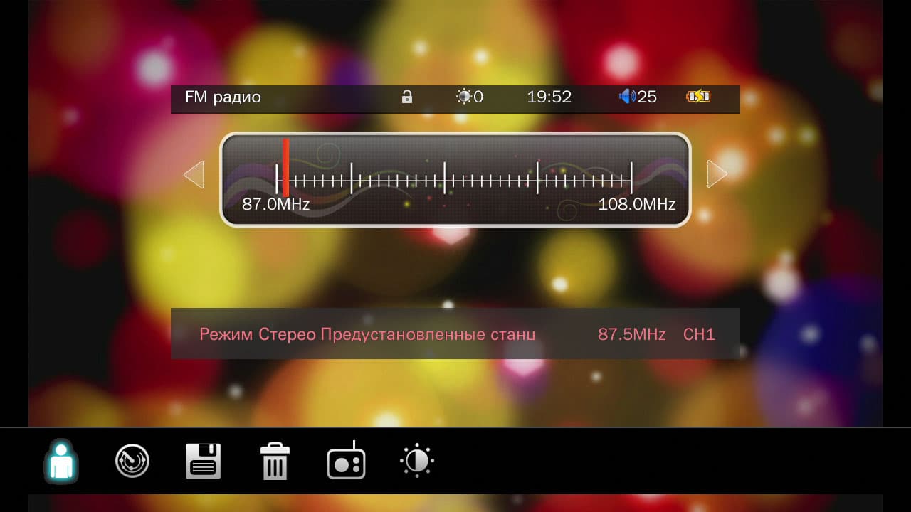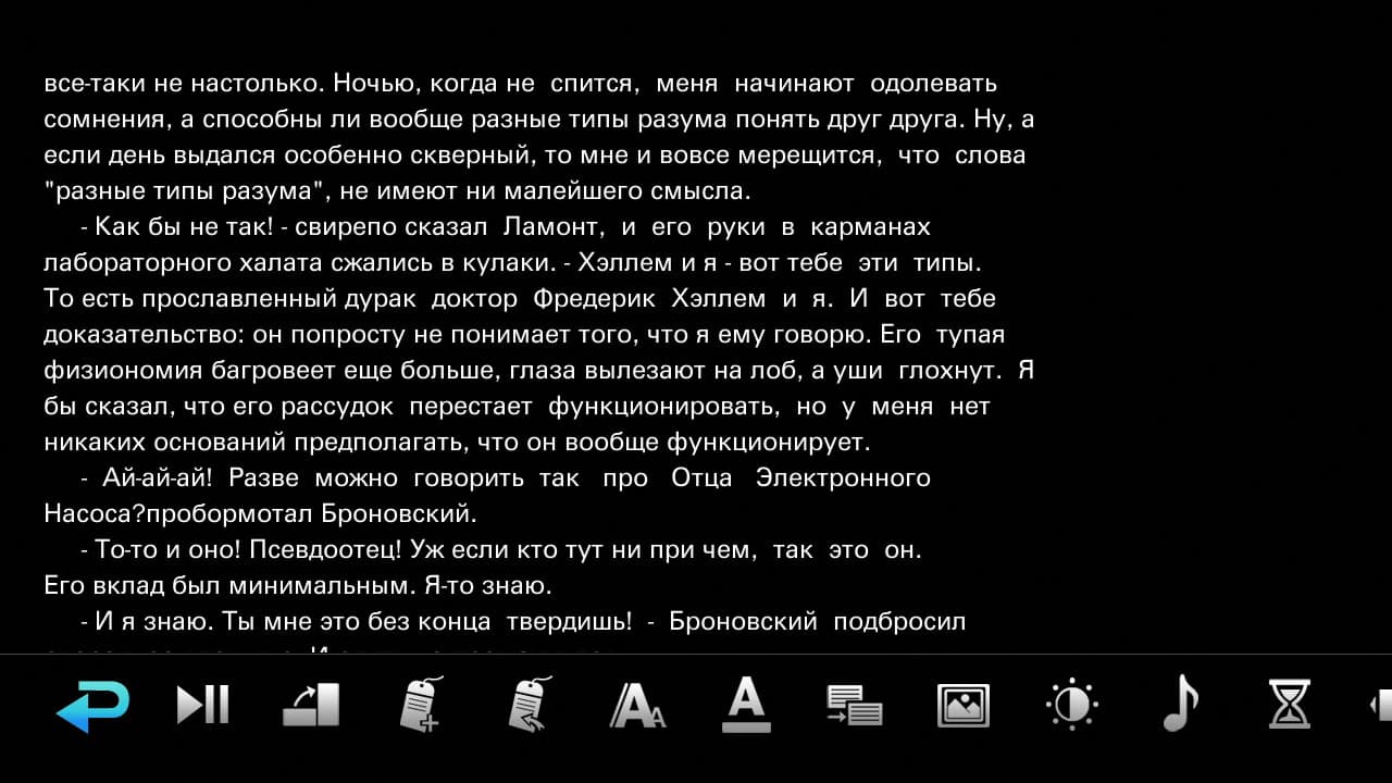 | Чтение книг. Со своей изначальной прошивкой (на которой плеер и тестировался), данный плеер мог распознавать только текстовые файлы, с кодировкой проблем не возникало. Новая прошивка позволяет читать файлы форматов *.TXT, *.PDF, *.FB2, *.EPUB. При подключении к ТВ фон страницы (довольно красивый) почему-то исчезает, заменяясь чёрным цветом. Во время чтения пользователь может выбрать шрифт, фон страницы, музыкальное сопровождение, интервал автоматического пролистывания и даже (!) включить озвучивание текста. Правда, электронные чтецы (женский и/или мужской голос) умеют говорить только по-китайски и по-английски. Причём английские тексты озвучиваются по-английски как и положено. Но если текст русский, то плеер начинает говорить… по-китайски! Интересно, какую околесицу нёсла эта чтица, озвучивая русский текст «чистым» китайским? | FM-радио имеет диапазон от 87 до 108 МГц, в качестве антенны выступает провод наушников, а потому с отключёнными наушниками вряд ли что «поймаешь». Здесь возможен автоматический и ручной поиск, сохранение найденных частот (до 12 станций), изменение яркости экрана во время прослушивания. |