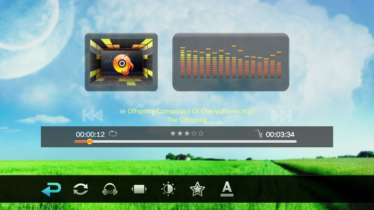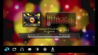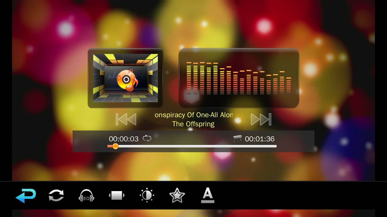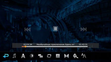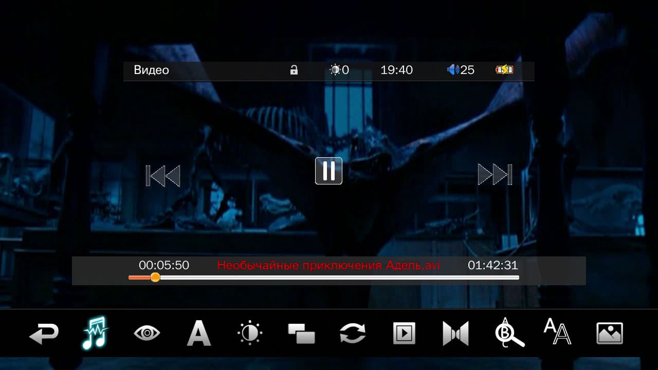 Во время проигрывания видео пользователь имеет возможность: выбрать звуковую дорожку, просмотреть информацию о проигрываемом файле, выбрать субтитры, изменить их размер и цвет, отрегулировать уровень яркости экрана, изменить соотношение сторон кадра, настроить режим повтора, на лету поменять разрешение видеовыхода, изменить характер отображения видео (на выбор — пять вариантов, от Естественного до Очень резкого).
