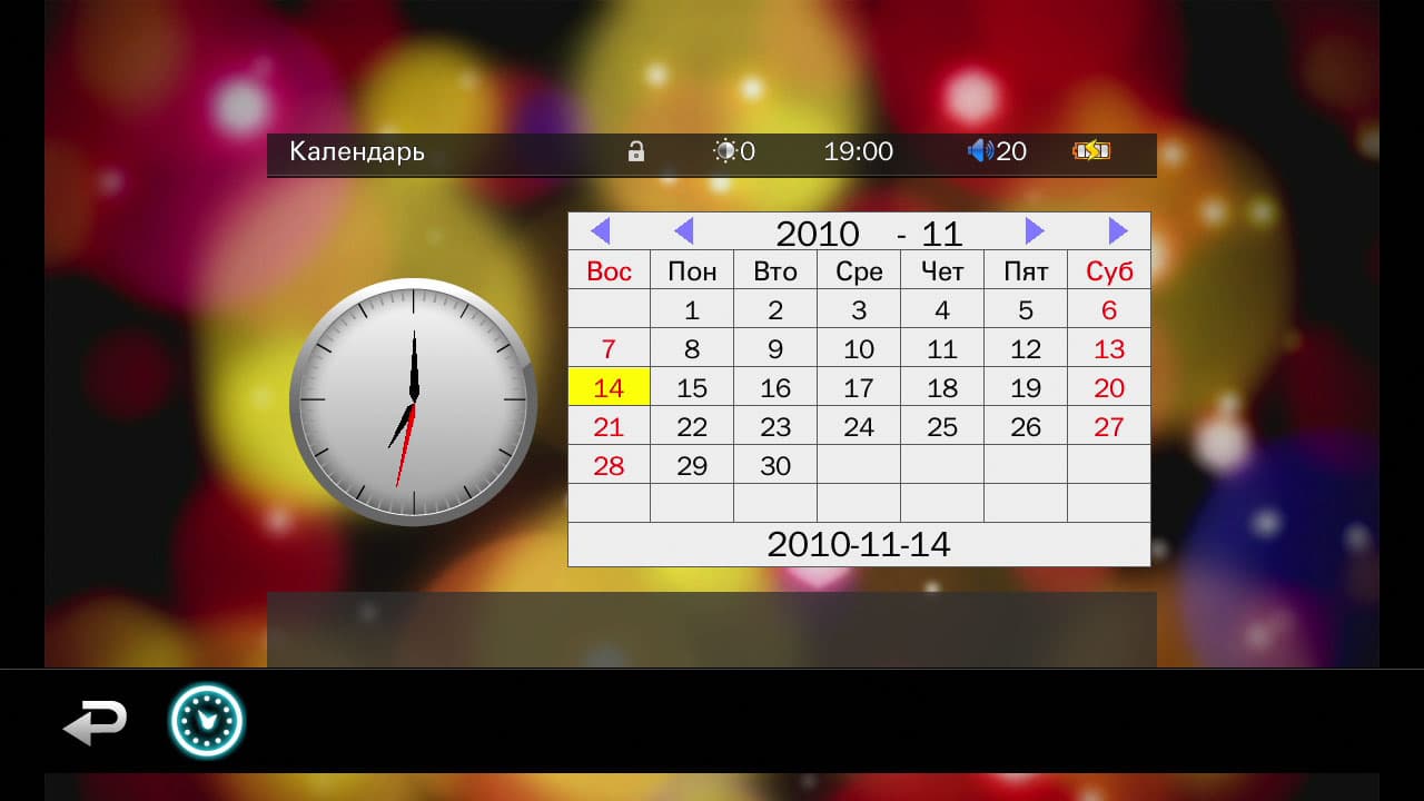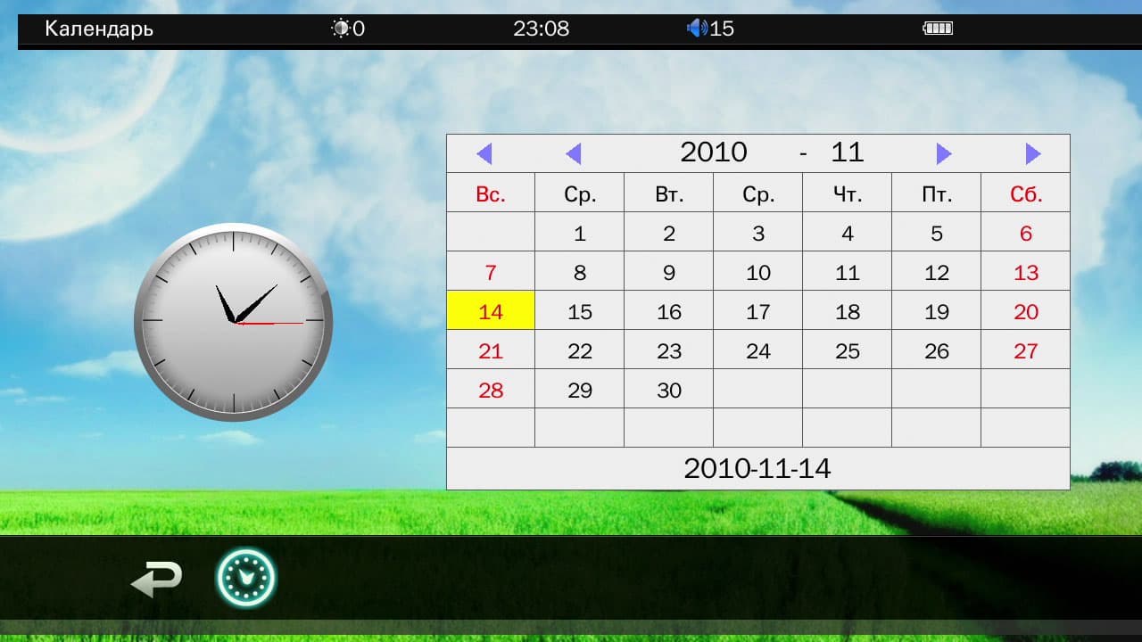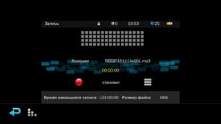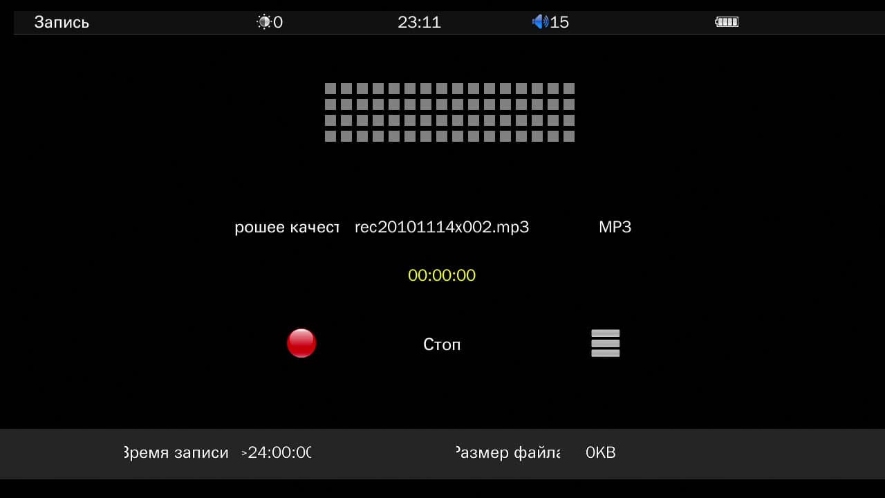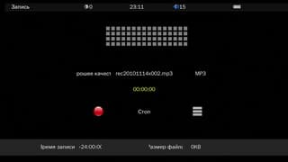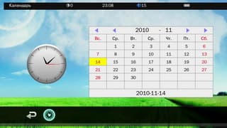 | В календаре нельзя делать какие-то записи (да и как это сделаешь без клавиатуры?). Назначение его — чисто декоративное. | Встроенный микрофон записывает довольно глуховато, без высоких частот, но вполне справляется с записью речи на расстоянии двух-трёх метров от говорящего. При записи создаётся файл MP3, качество записи выбирается из трёх существующих предустановок: 320, 160 и 80 Кбит/с. |