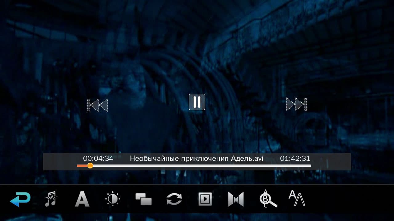 Проигрывание видео сопровождается возможностью выбора звуковой дорожки, изменения цвета и размера субтитров, смены яркости экрана, изменения соотношения сторон кадра, выбора режима повтора и настройки звука.