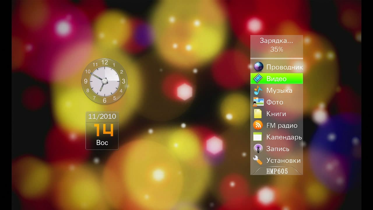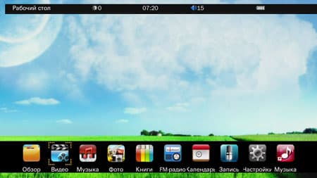 Перейдём к 805-му плееру. Его интерфейс фактически повторяет интерфейс малогабаритного брата, за несколькими исключениями и особенностями. Например, при подключении плеера к телевизору на рабочем столе, в области пиктограмм, отчего-то появляются чёрные полосы.