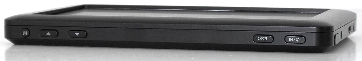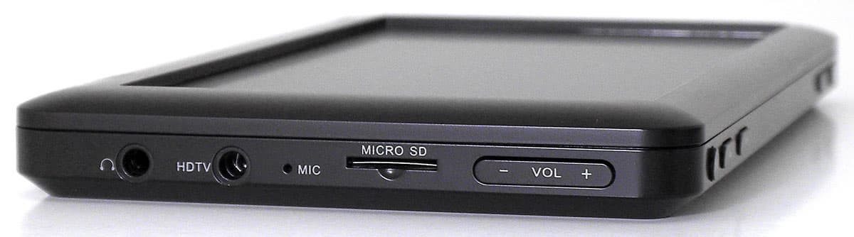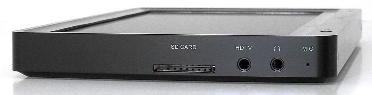 В правом торце находятся выход на наушники, компонентный (он же композитный) видеовыход, встроенный микрофон, слот для карт памяти microSD ёмкостью до 32 ГБ и кнопка-качалка для регулировки громкости.