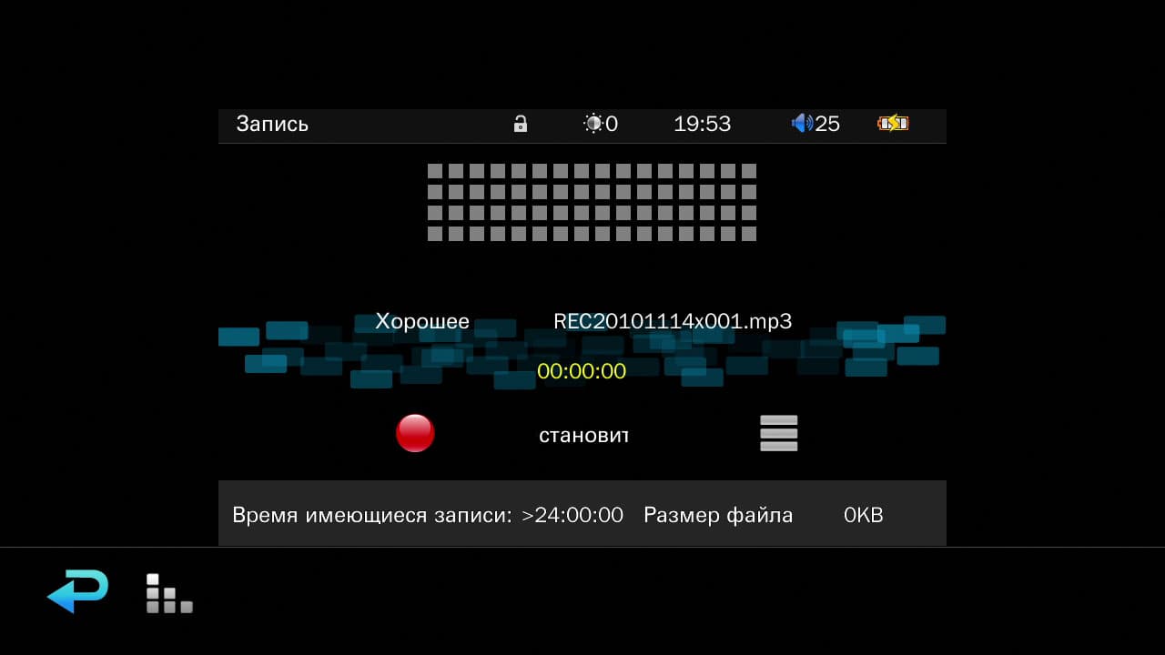 Во время любой операции пользователь может вывести панель дополнительных настроек, которая выплывает в нижней части экрана. Пиктограммы, имеющиеся в данной панели, не подписаны, но за несколько дней эксплуатации плеера к ним привыкаешь, понимая их назначение без подсказок. Разумеется, набор этих значков может существенно отличаться в зависимости от текущего режима работы устройства.