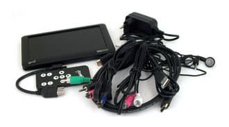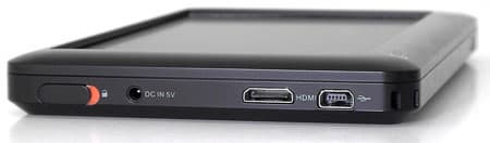 Изучим вначале дизайн меньшего, 605-го, плеера. На левой грани его корпуса расположены: ползунок для блокирования клавиш от случайного нажатия, вход для блока питания, выход HDMI 1.3 и порт mini-USB для подключения плеера к ПК. Но не только к ПК! Данный порт играет также роль интерфейса USB-Host, к которому, с помощью прилагаемого USB-переходника, можно подключить какой-либо внешний USB-накопитель. В левом нижнем углу корпуса имеется ушко для продевания ремешка.
