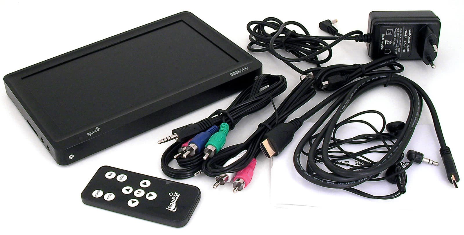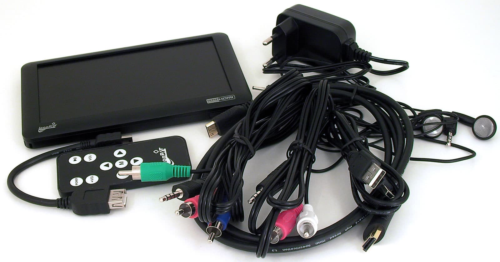 Если при соединении плеера с ТВ по HDMI-кабелю никаких вопросов обычно не возникает, то в случае аналогового подключения пользователю требуется запастись некоторой информацией. Так, возможно, читатель хочет узнать: каким образом один аналоговый видеовыход в плеерах может работать сразу в качестве двух источников сигнала, компонентного и композитного? Iconbit использует довольно простое решение: сначала требуется подключить плеер к телевизору с помощью прилагаемого видеокабеля, имеющего четырёхконтактный мини-джек на одном конце (для соединения с плеером) и три стандартных «тюльпана» (красный-синий-зелёный) — на другом, предназначенные для подключения к ТВ. Если телевизор оснащён компонентным видеовходом, то и соединять нужно соответственно: красный-красный, синий-синий, зелёный-зелёный. Теперь остаётся лишь зайти в настройки плеера и выбрать нужное разрешение с префиксом YPbPr (данное буквосочетание означает способ передачи сигнала по компоненте). Если же телевизор не имеет компонентного входа, а оснащён лишь композитным, то в таком случае к этому единственному ТВ-входу требуется подключить тюльпан зелёного цвета (именно по зелёной жиле передаётся композитный сигнал), а в настройках плеера выбрать AV PAL либо AV NTSC, в зависимости от используемого ТВ-стандарта. Следует заметить, что в обоих случаях подключение звука нужно производить отдельно, с помощью прилагаемого двухтюльпанного аудиокабеля, соединив аудиовыход плеера с аудиовходами телевизора.