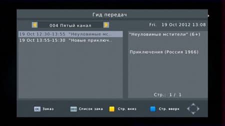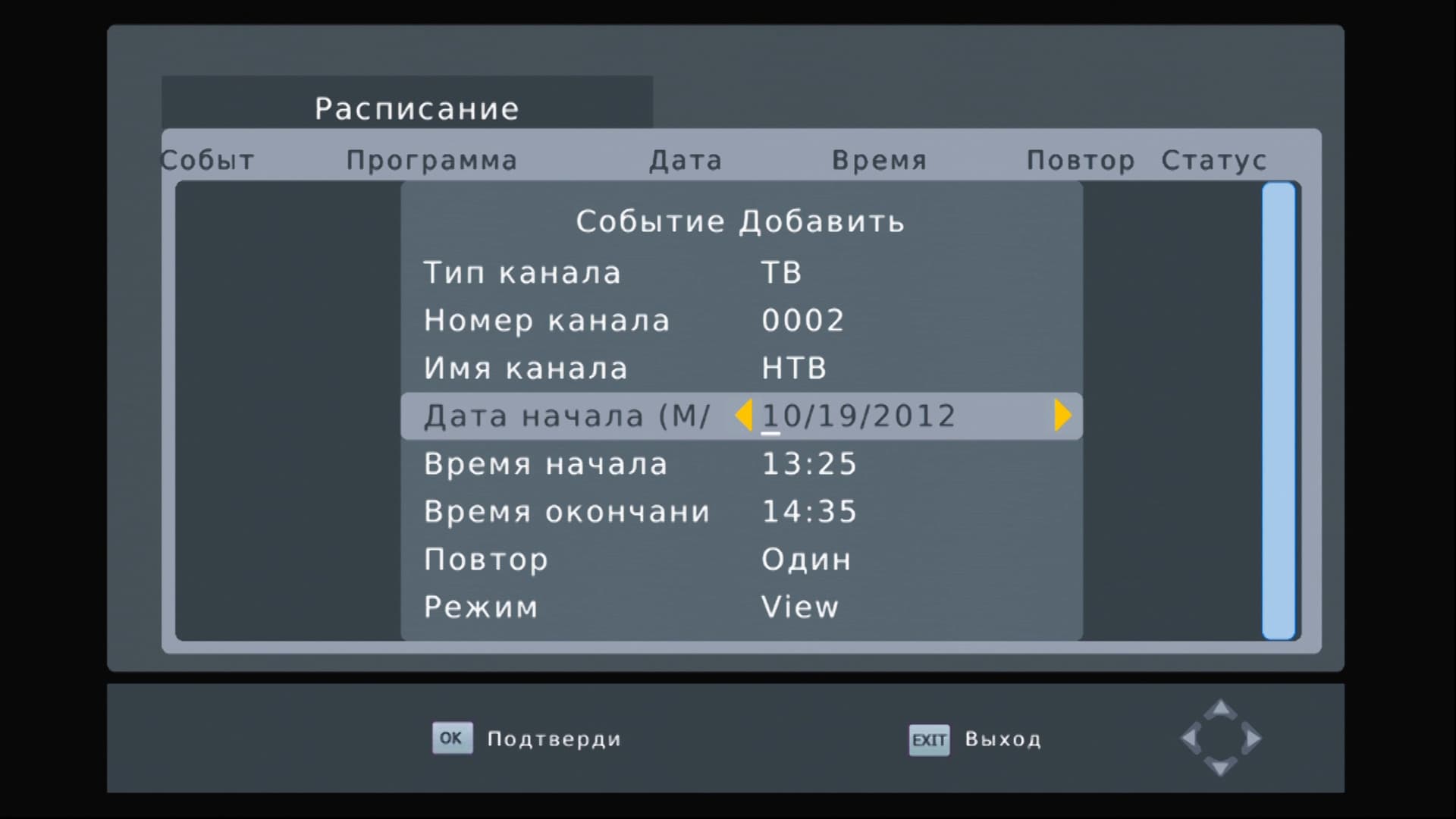 Приставка умеет, как и любой плеер с ТВ-тюнером, запланировать включение или запись нужной программы в нужную дату и время. Имеющиеся в расписании пункты довольно гибко позволяют настроить все возможные параметры: тип канала (ТВ, радио), его номер, название, старт просмотра или записи, время начала и окончания, а также собственно режим работы: просмотр либо запись. Телевизор, конечно же, для этого не нужен — устройства работают автономно, им нужна только антенна.