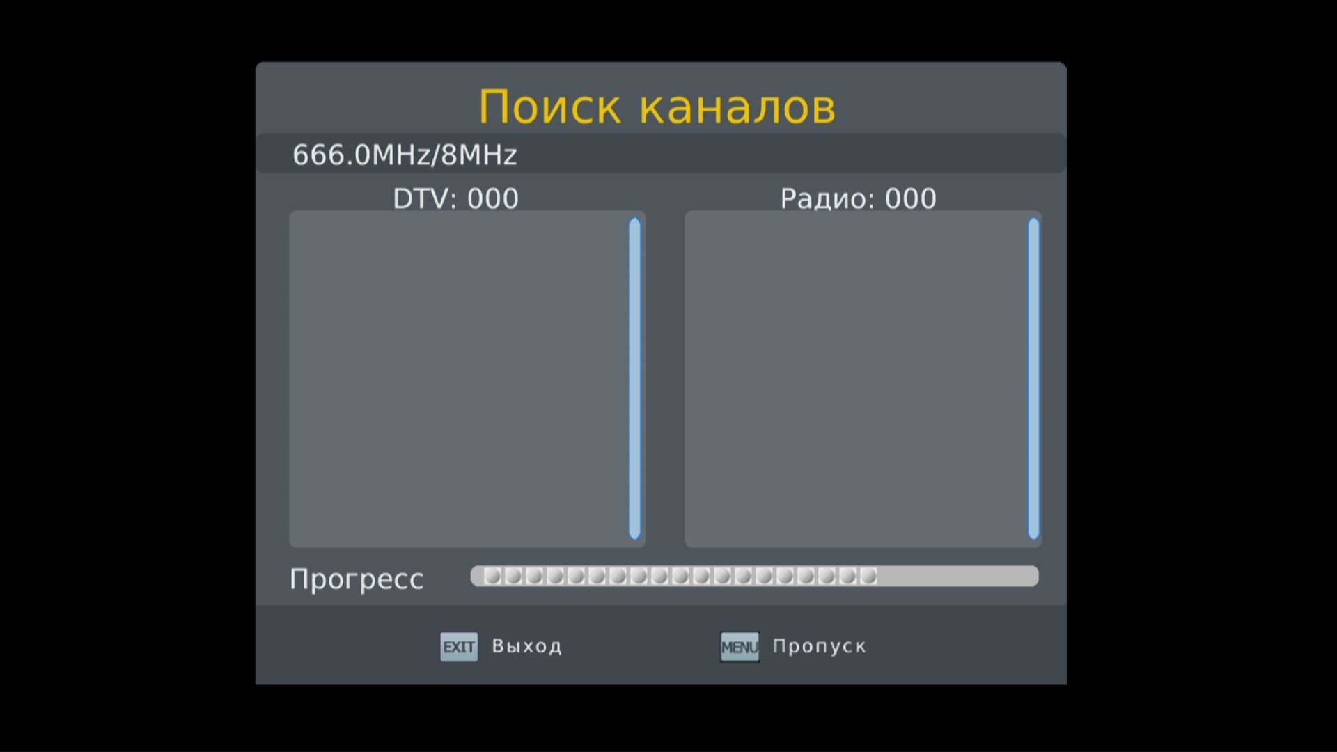 В отличие от предыдущего плеера, этот аппарат в результате поиска каналов вывел пустое окно. Правда, во время поиска на экране мелькнули ненадолго три каких-то строчки, но тут же пропали. Первое подозрение — тюнеру не хватает чувствительности.