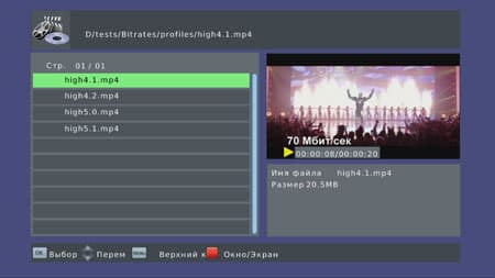Файловый браузер напоминает список телеканалов, где выбрать нужный канал помогает окно предпросмотра. Нажатие ОК на любом из файлов приведёт к тому, что выбранный файл станет проигрываться не в полном экране, как это сделано во всех медиаплеерах, а в небольшом окне, расположенном в правой части экрана. Чтобы запустить полноэкранный режим показа, следует нажимать кнопку воспроизведения, а не привычную многим кнопку ОК. Впрочем, изменить режим отображения с оконного на полноэкранный можно в любой момент, нажав красную кнопку на пульте ДУ.
