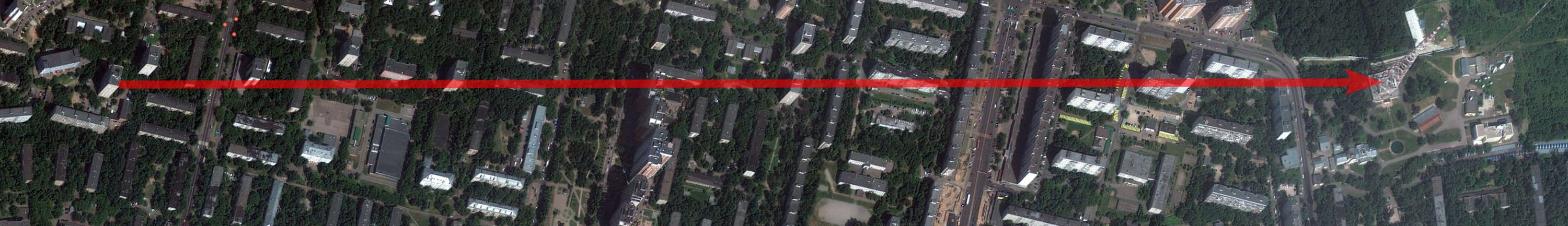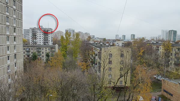 Вот он, на фотографии, сделанной с балкона квартиры — вышка с трудом, но всё же различима в октябрьской московской дымке.