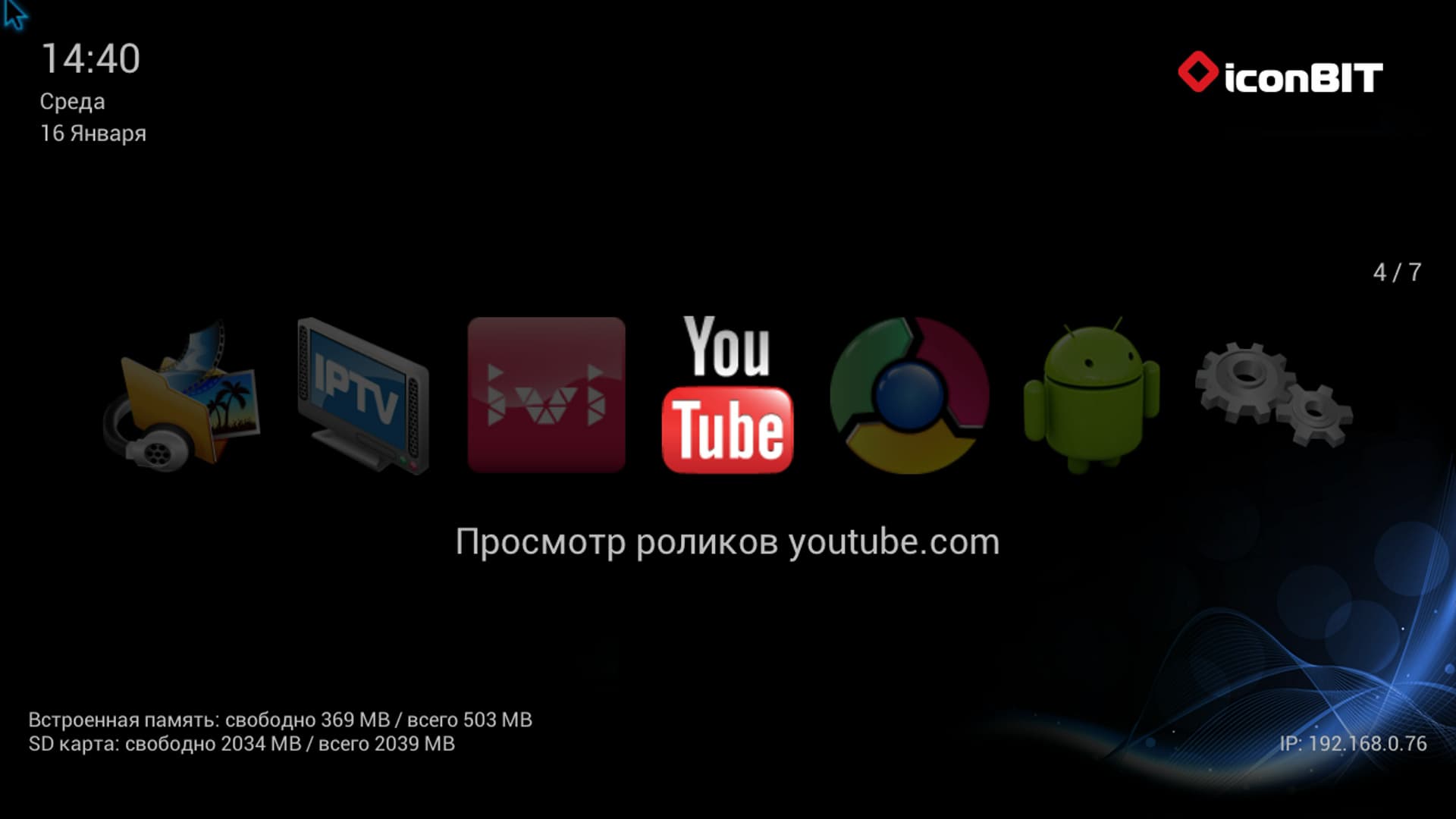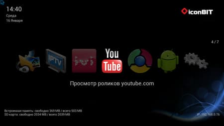 В текущей прошивке аппарата, на которой он тестировался, главное меню представляет собой список из семи иконок. Здесь имеется и файловый браузер, и упоминавшееся приложение Медиацентр. В виде отдельных иконок присутствуют небезызвестные сервисы ivi.ru и YouTube. Замыкают список веб-браузер, иконка перехода в Android-лаунчер, и пиктограмма, открывающая настройки Android.