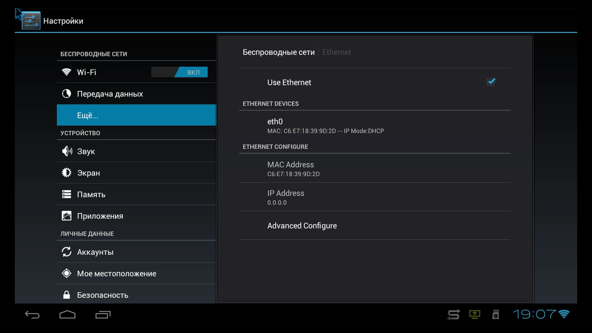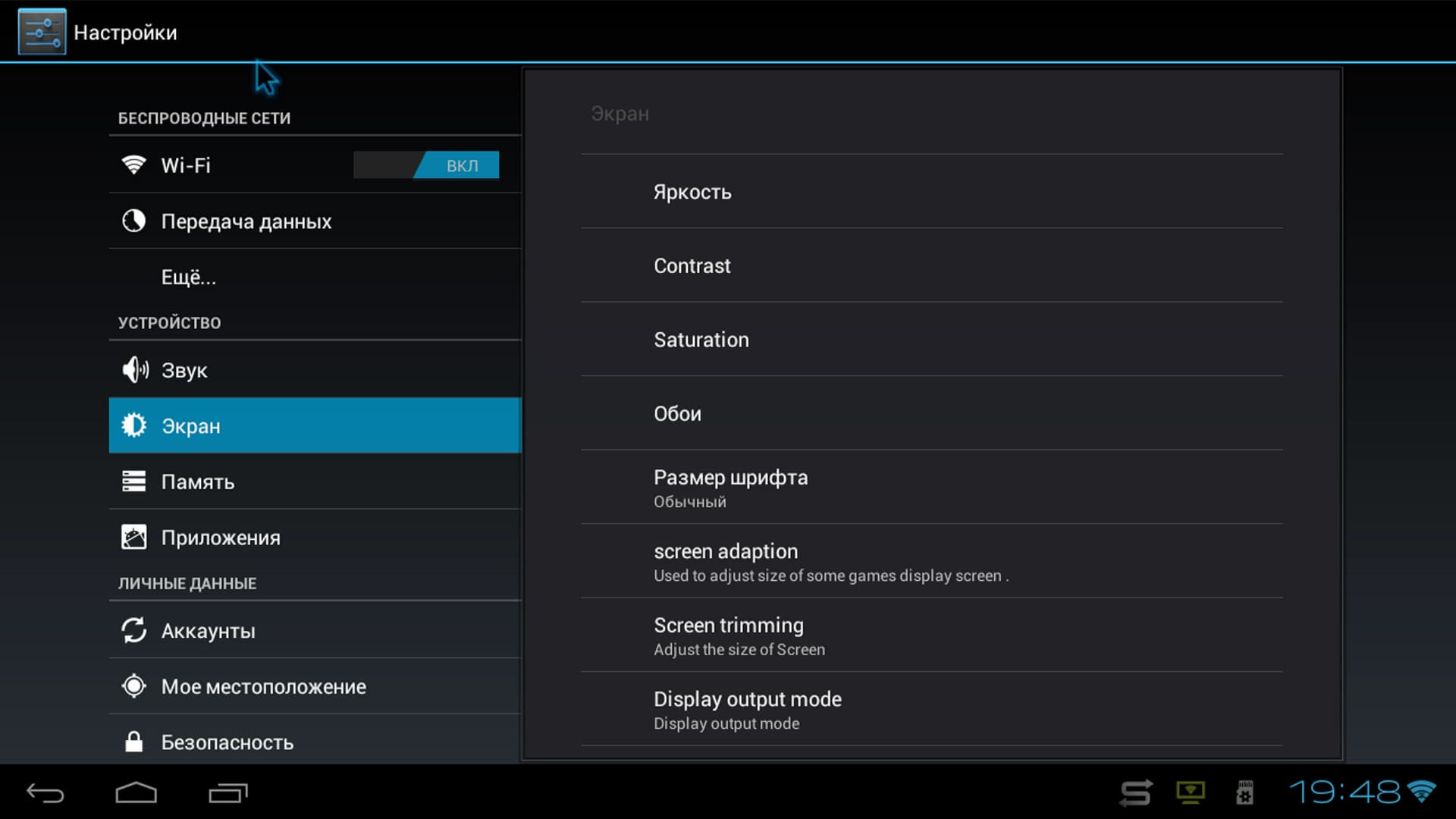 Ну какие могут быть настройки у операционной системы Android? Разумеется, Android-ные, вполне стандартные. В текущей тестовой версии прошивки эти настройки не имеют особо примечательных пунктов. Разве что более глубокие, чем в телефонах или планшетах, настройки режимов отображения.