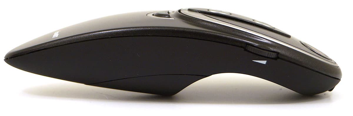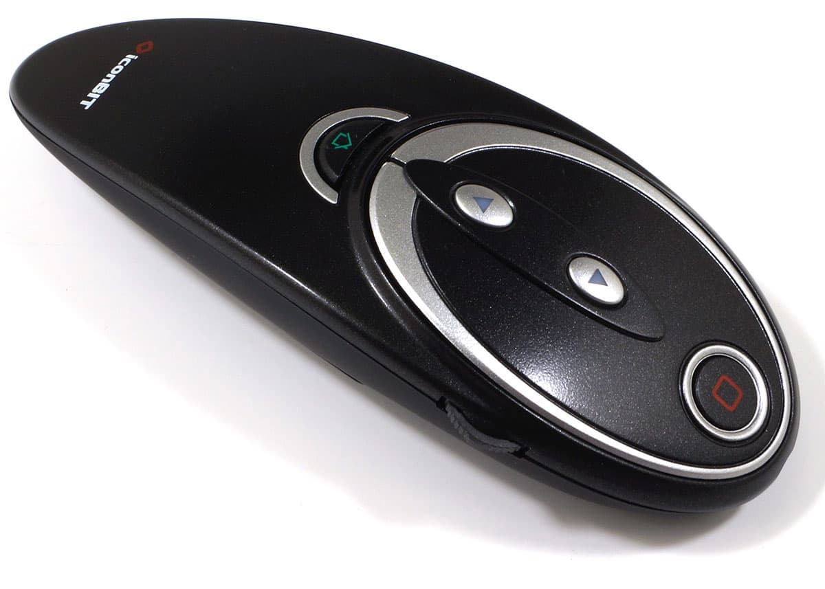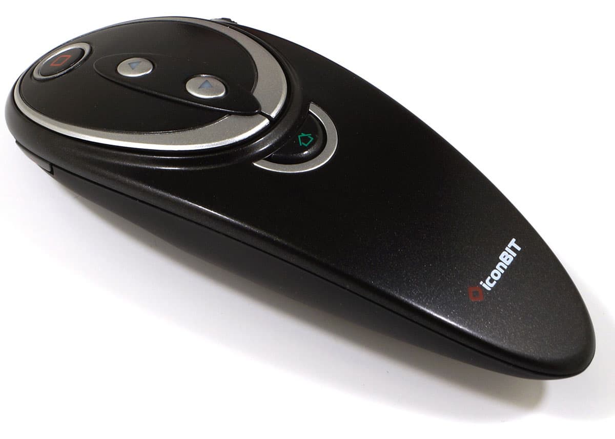 Поскольку автор уже имеет опыт работы с подобным гироскопическим указывающим устройством (iconBIT Toucan W комплектовался пультом с такой же технологией, но более широкими возможностями), сложностей в привыкании не появилось абсолютно никаких. Пульт работает не на инфракрасных лучах, а в цифровом радиоканале 2,4 ГГц. Встроенный гиродатчик постоянно отслеживает координаты пульта, его текущее положение, скорость перемещения. Мини-ПК, принимая эти данные, обрабатывает их, и в результате курсор на экране движется подобно лазерной указке. С одним отличием: указку обязательно следует направлять на какой-либо объект, а человек с гиропультом в руках может направлять его куда вздумается. Хоть боком повернуться.