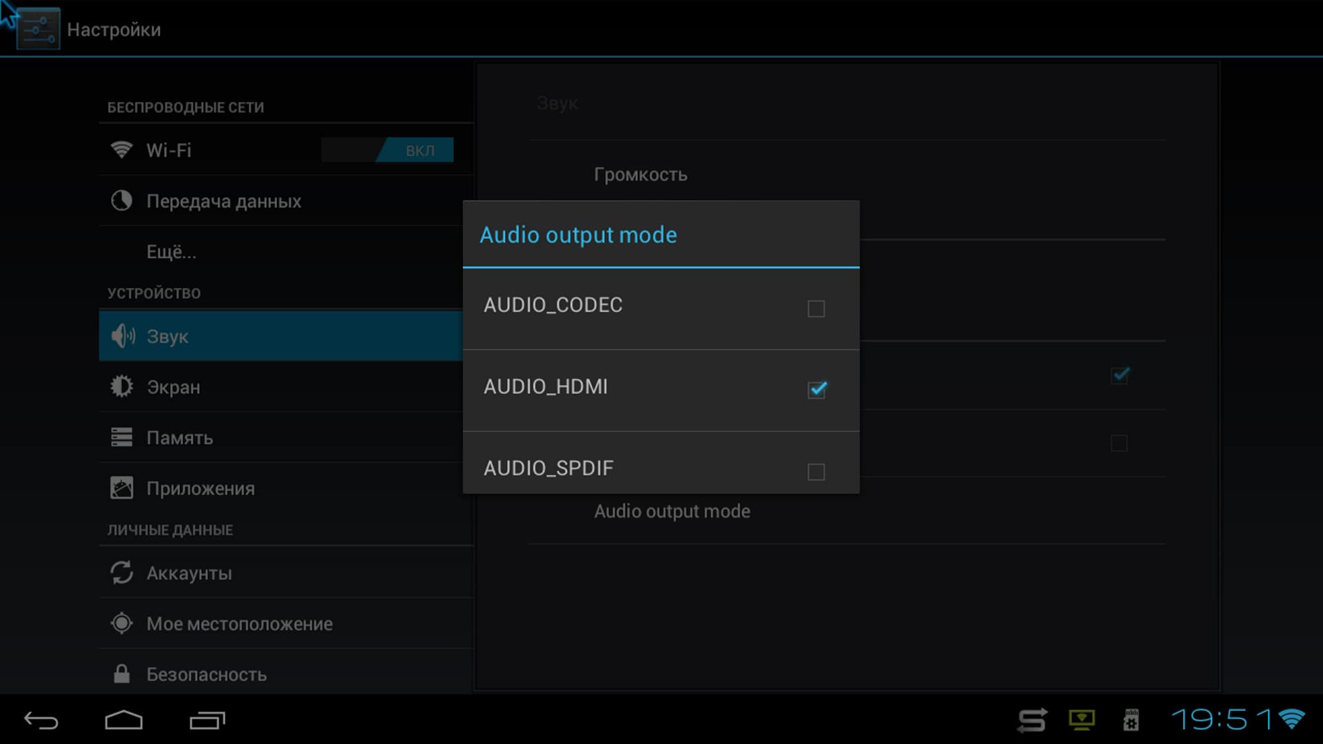Настройки звука также отличаются от стандартных телефонно-планшетных. Ввиду того, что Manta имеет три звуковых выхода, в настройках появились соответствующие параметры. Как видно на следующем рисунке, пользователь имеет возможность активировать один из трех способов вывода звука: