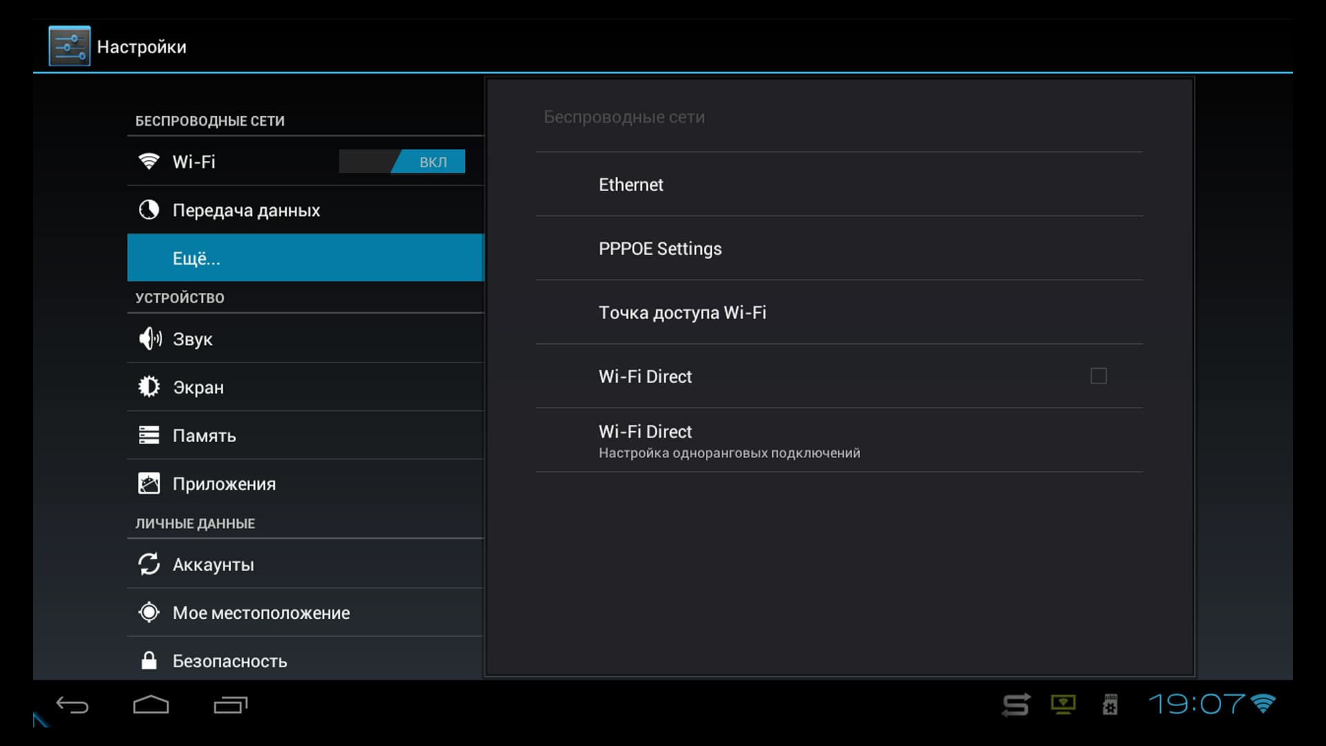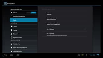 В этих сетевых настройках можно видеть, что наш аппарат, подобно телефону, умеет выполнять функции роутера, то есть, попросту, активировать точку доступа и «раздавать» интернет по Wi-Fi.