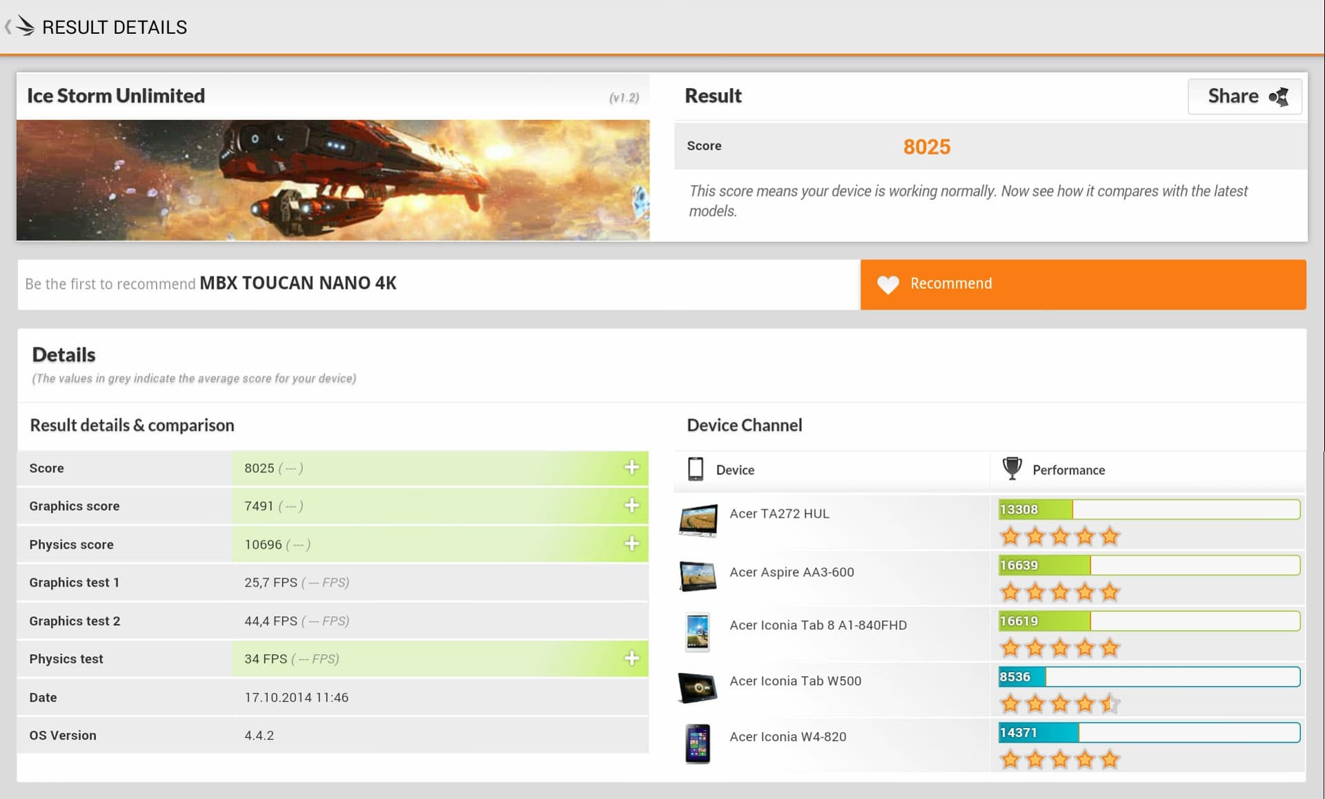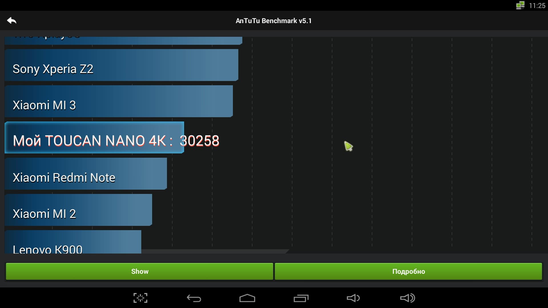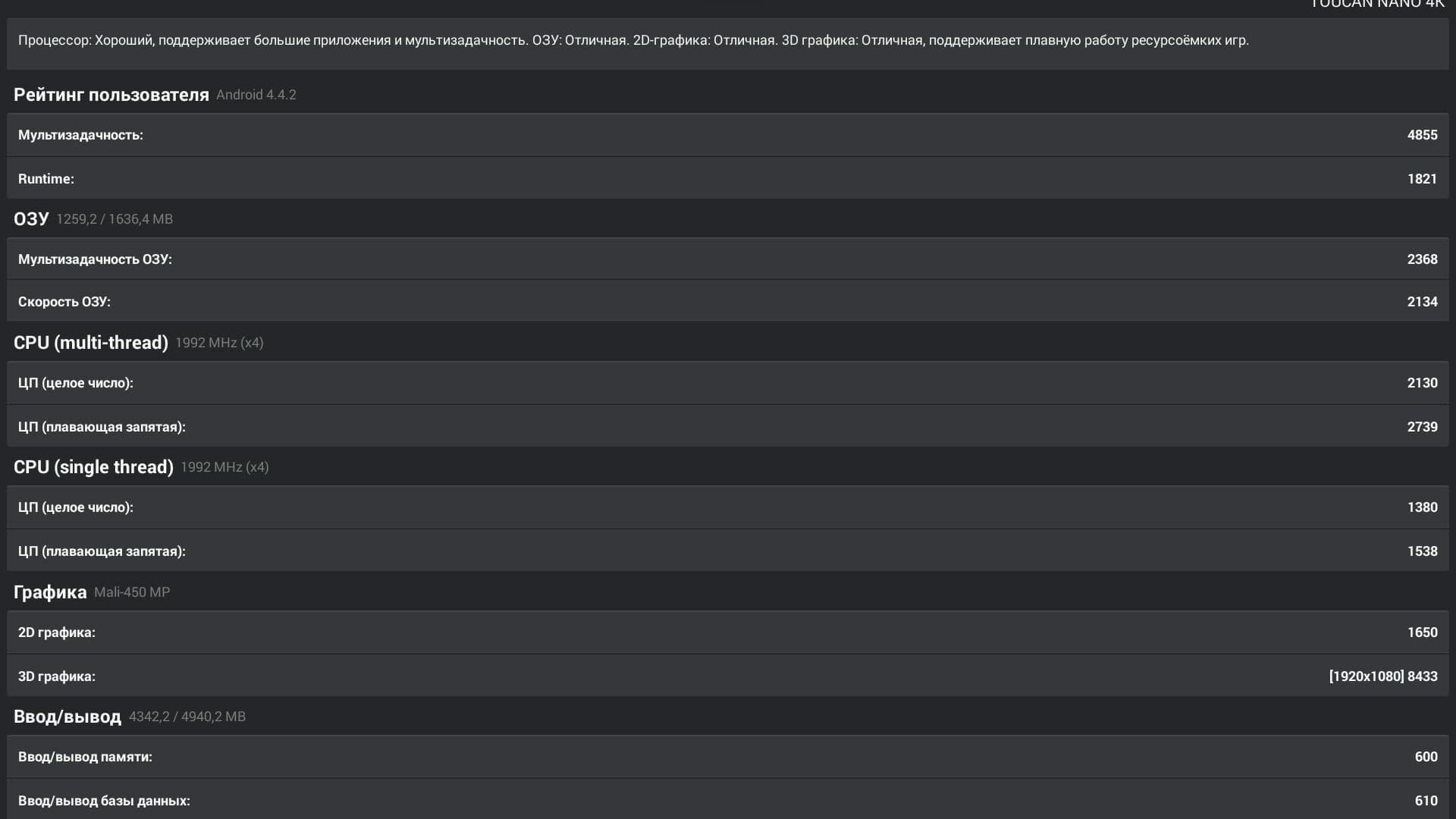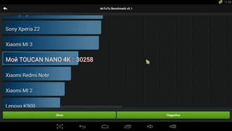 Традиционно для Android-устройств приводим скриншоты результатов тестирования в некоторых распространенных тестовых пакетах. Здесь можно видеть, что Iconbit Toucan Nano 4K вовсе не лидер по вычислительной способности. Однако насколько ценна эта информация, если сравнение здесь проводится исключительно с мобильными гаджетами?