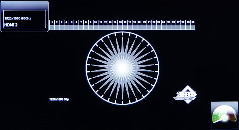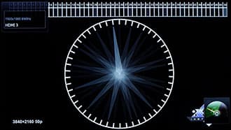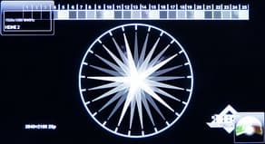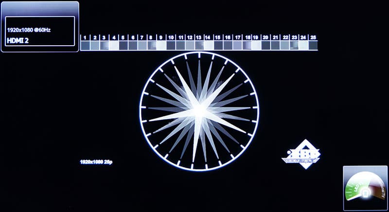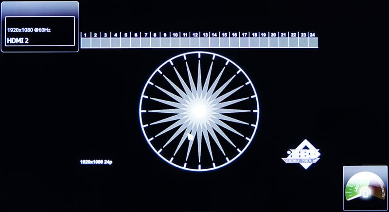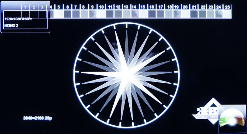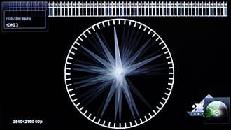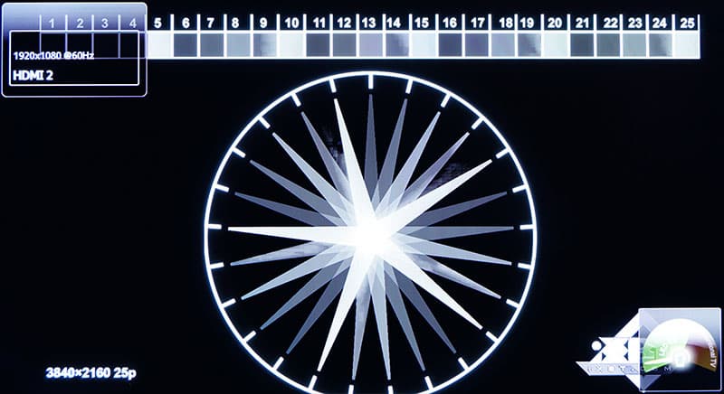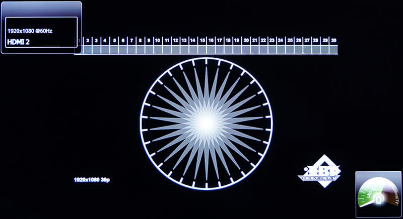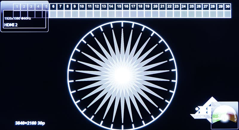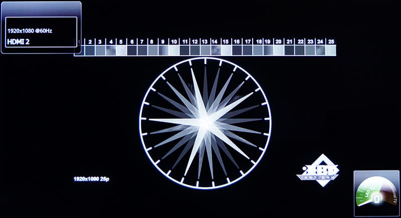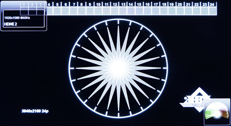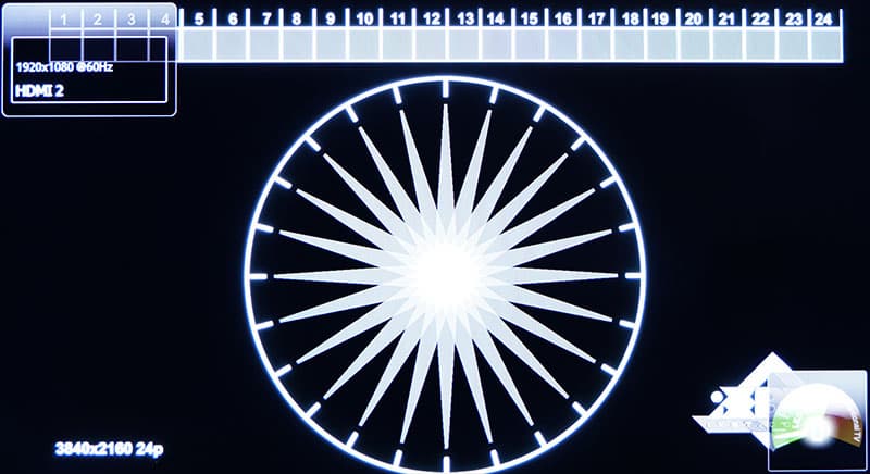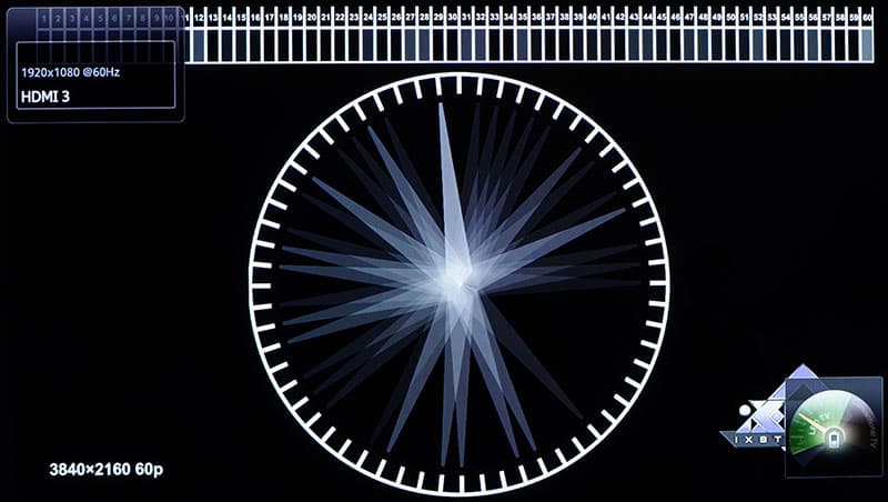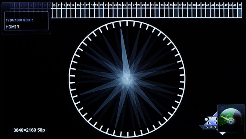 Для проверки корректности отображения видеофайлов с различной частотой кадров мы традиционно воспользуемся набором тестовых роликов с перемещающимися на одно деление за кадр стрелкой и прямоугольником (см. Методику тестирования устройств воспроизведения и отображения видеосигнала). При тестировании использовалось видео с размером кадра 1920×1080, но разными частотами: от 24 до 60 кадр/с, а также три ролика с размером кадра 4K и частотой 24, 25 и 30p (включение в методику 4K-файлов c более высокими частотами мы считаем пока еще преждевременным, сегодняшний потребительский рынок не знает подобного контента).