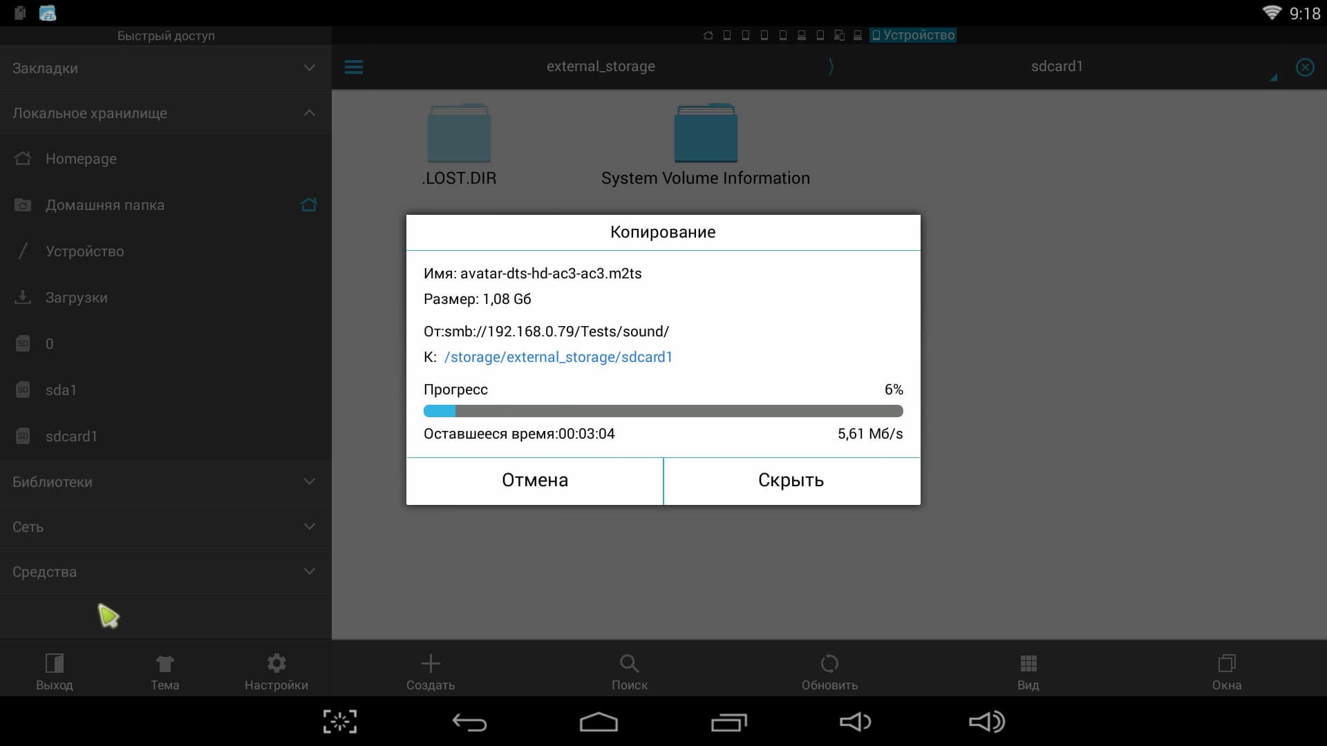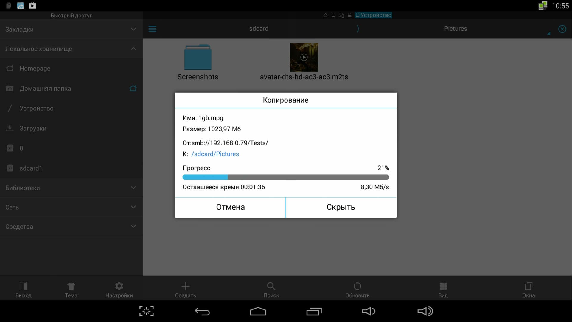 В заключение настроечной главы проверим скорость работы сетевых адаптеров устройства. Проделаем это путем копирования обычного файла с сетевого хранилища.